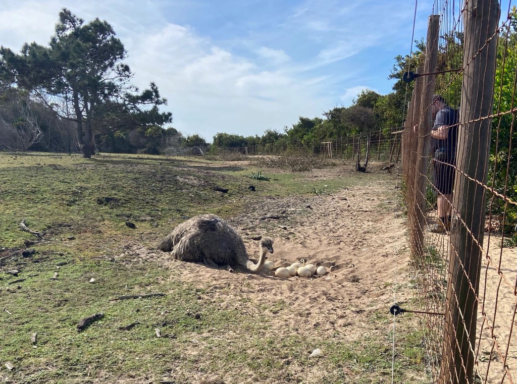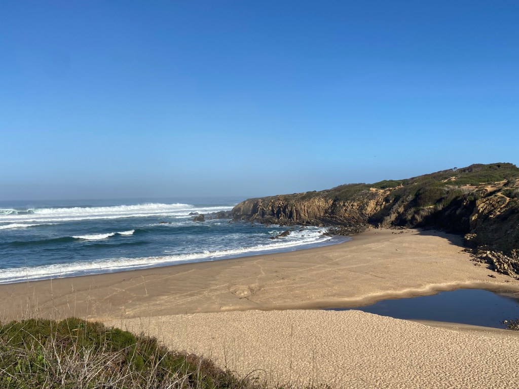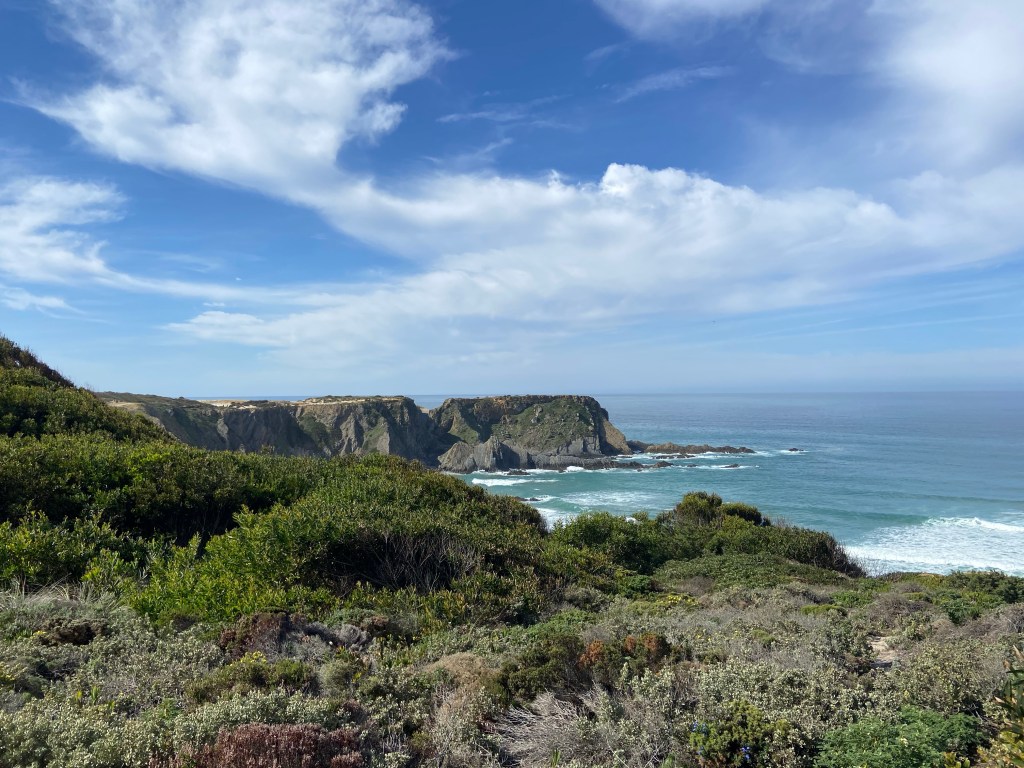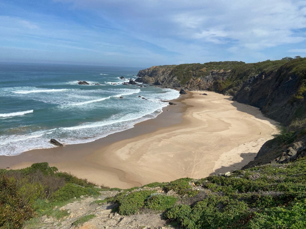 Nach dem wunderschönen Praia do Carvahal, einem beliebten Sandstrand, führt uns der Weg entlang eines Wildgeheges. Hinter dem Zaun brütet ein Strauß seine immensen Eier aus. Vorsichtig und leise schleichen wir uns vorbei, um dem Vogel nicht zu stören. Schon bald nach dem Gehege gelangen wir erneut an die Küste. Im leichten auf und ab führt uns der Weg durch eine abwechslungsreiche Landschaft. Zum ersten Mal wird der Weg innerhalb eines kleinen Hains matschig und unsere Wanderschuhe versinken ausnahmsweise nicht im Sand, sondern im Schlamm.