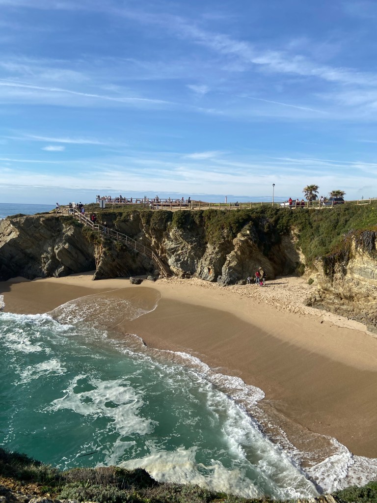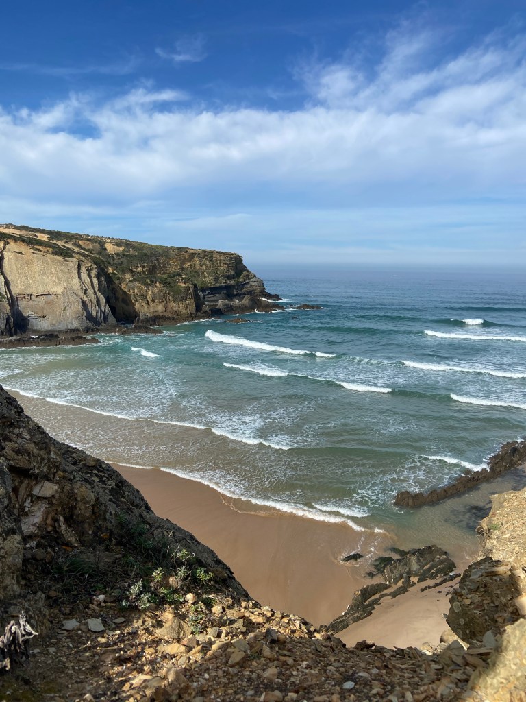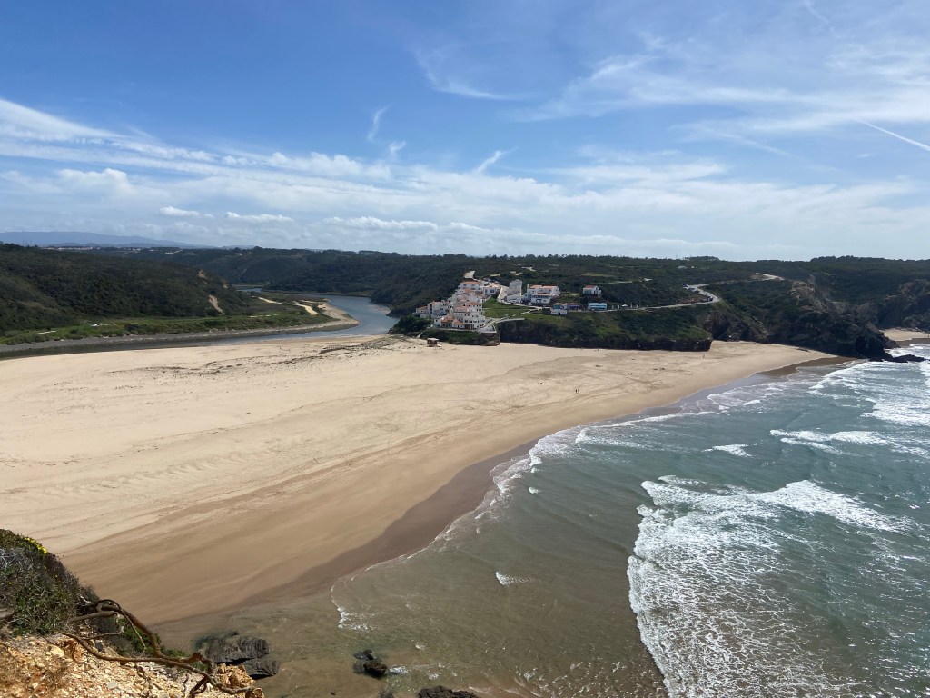 Entlang landwirtschaftlichen Betrieben mit Feldern und Gewächshäuser, weiteren Küstenabschnitten und tollen Felsformationen führt uns der Weg nun in das Dörfchen Azenha do Mar. Über eine steile Holztreppe verlassen wir das kaum touristisch erschlossene Dorf in Richtung Fischerhafen. Bald verwandelt sich der Weg wieder in eine weiche Sandpiste. Auf ca. 3 weiteren Kilometern sinken wir bei jedem Schritt in den feinen Sand ein. Gemütlich gehen wir durch die traumhafte Landschaft und unterhalten uns darüber, was wir in den letzten Tagen alles erlebt haben. Nach der Anstrengung wird man bei Ponta em Branco mit einer spektakulären Sicht auf die Mündung des Seixe-Flusses, der vom Fluss angelagerten Sandbank und dem Ortsteil Odeceixe Praia belohnt.