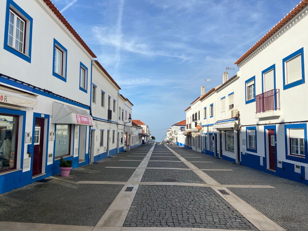 Von dort führt der Weg 2 Kilometer entlang einer stark befahrenen Straße. Der monotone Weg, welcher schnurgerade führt, erweckt den Eindruck nie enden zu wollen. Da wenig Ablenkung vorhanden ist, merkt man allmählich die schmerzenden Füße. Fast verpassen wir die Abzweigung, die den Weg wieder von der Straße in Richtung Küste lenkt. Nach einem Kilometer wohltuender Abwechslung erreichen wir zufrieden den Ort Zambujeira do Mar, in dem wir für die nächsten anderthalb Tage verweilen werden.