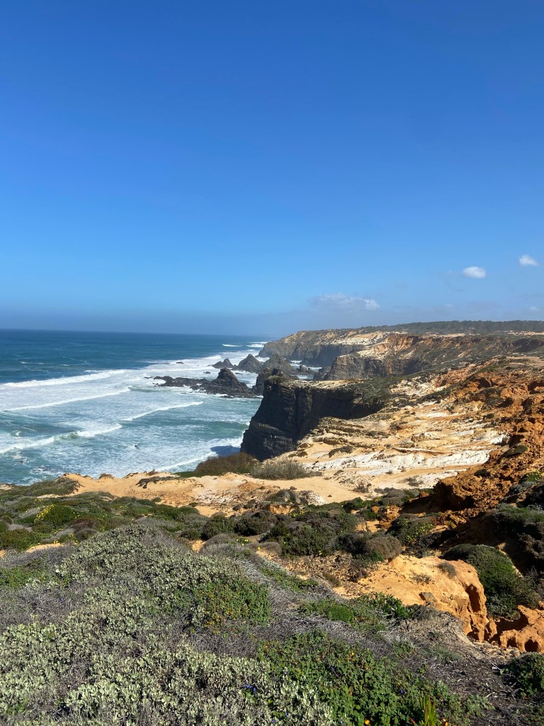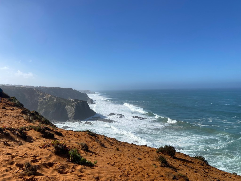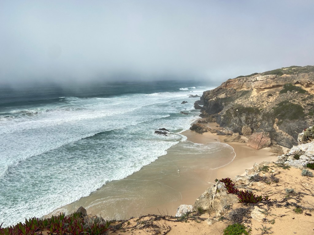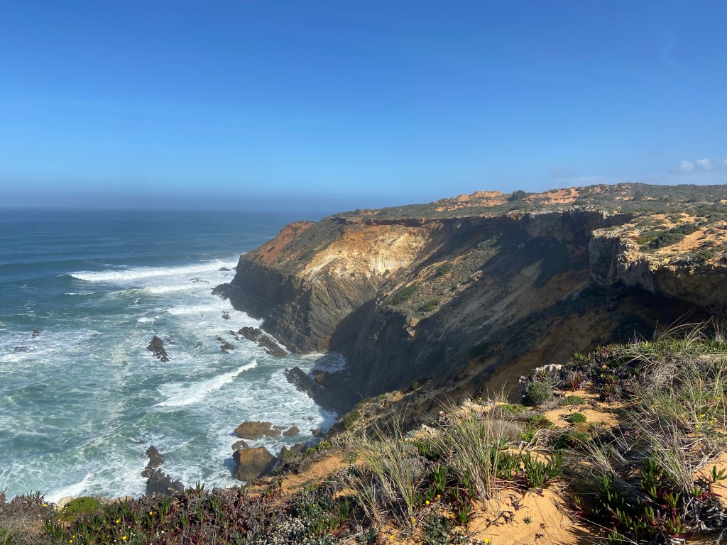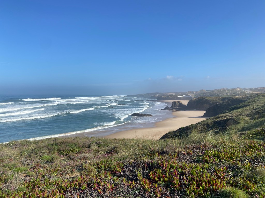 Ein letztes Mal zieht es uns auf die schmalen Pfade entlang Portugals Steilküste. Der steinige und sandige Pfad führt uns durch unzählige Mittagsblumen an der Steilküste weiter. Am Cabo Gorda führt der Weg wieder etwas in Landesinnere hinein in einen Kiefernwald. In diesem verweilen wir nicht lange und schon bald führt uns der Weg wieder in Richtung Küste und den sandigen Wegen.