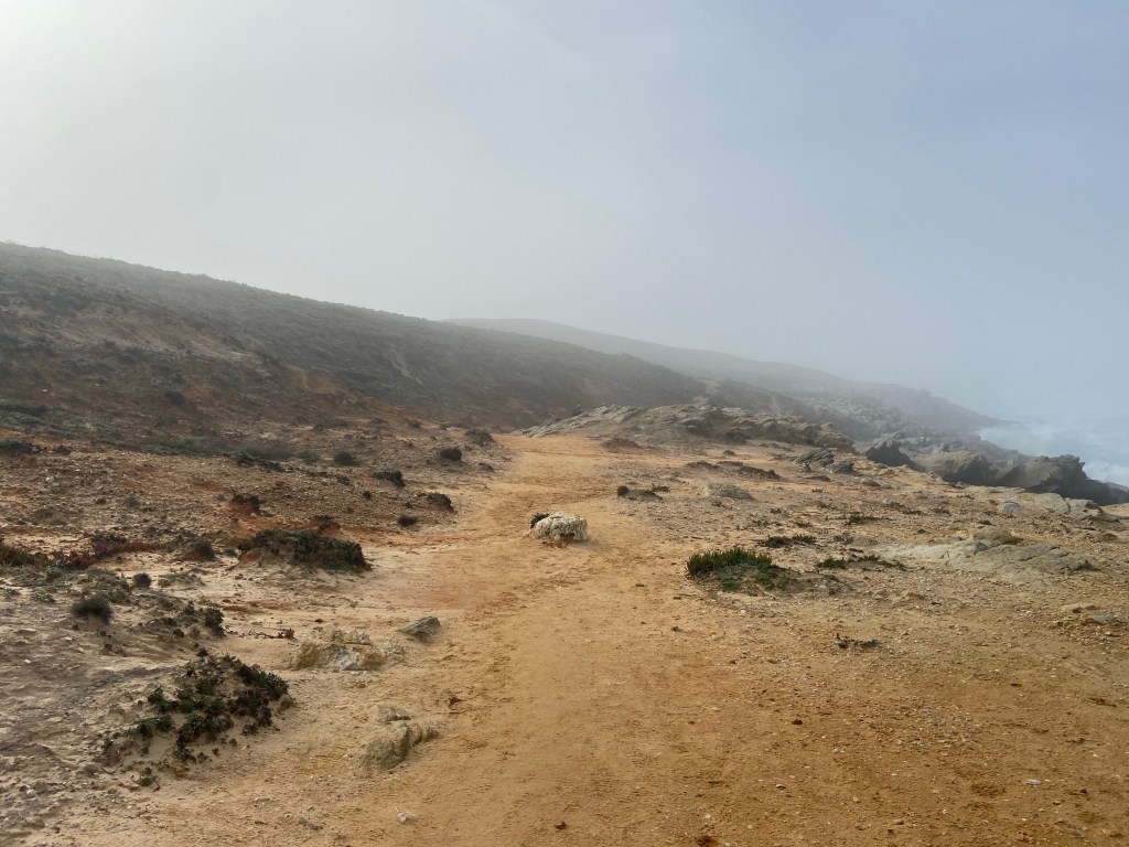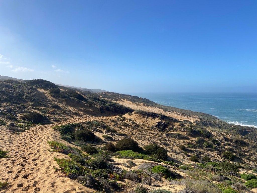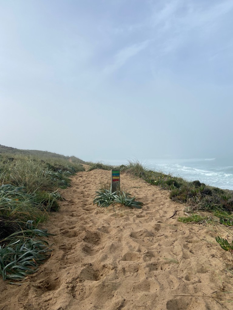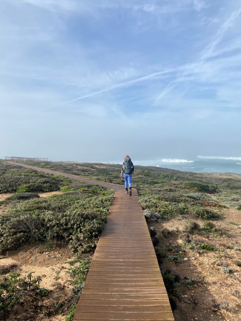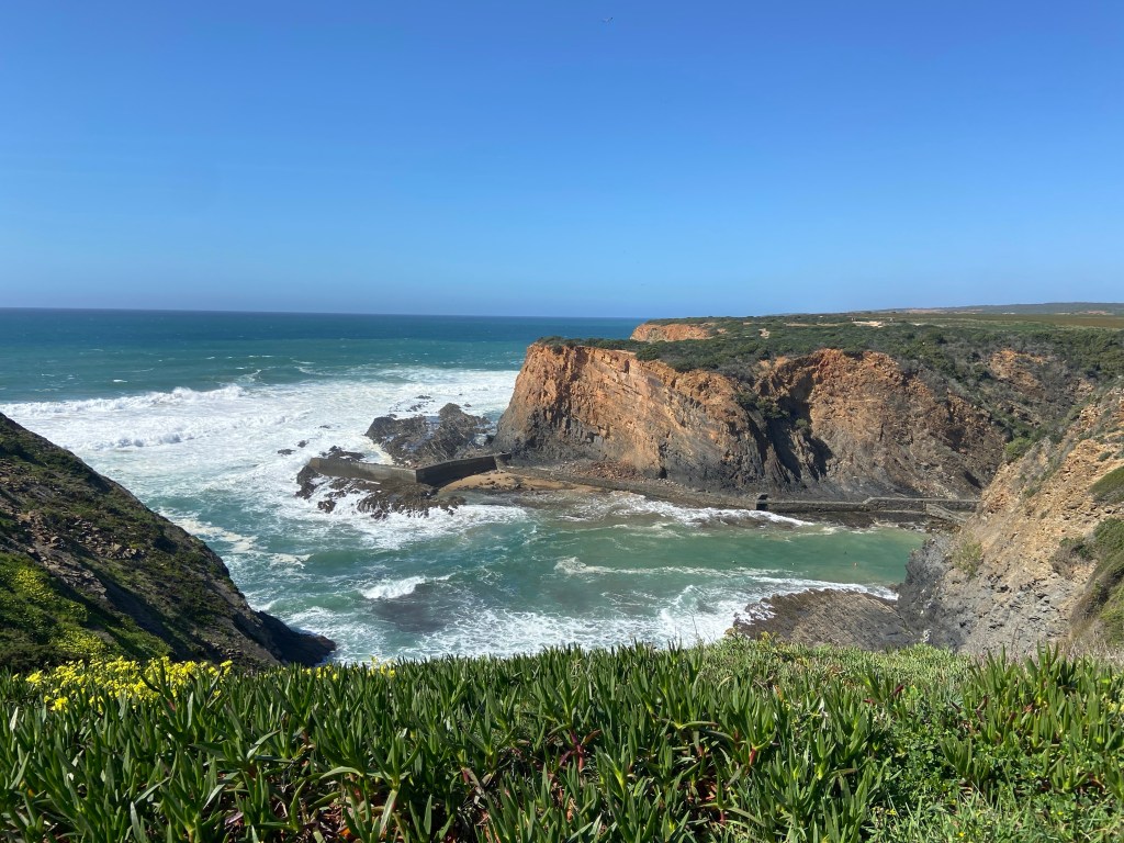 Ein letztes Mal zieht es uns auf die schmalen Pfade entlang Portugals Steilküste. Der steinige und sandige Pfad führt uns durch unzählige Mittagsblumen an der Steilküste weiter. Am Cabo Gorda führt der Weg wieder etwas in Landesinnere hinein in einen Kiefernwald. In diesem verweilen wir nicht lange und schon bald führt uns der Weg wieder in Richtung Küste und den sandigen Wegen.