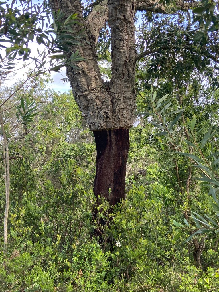 Die ersten Kilometer zeigen sich wenig spektakulär, denn der Weg führt entlang einer relativ stark befahrenen Straße. Doch danach zeigt der Fischerpfad wieder, warum er als einer der schönsten Fernwanderwege Europas zählt. Als wir die Straße verlassen, finden wir uns in einem kleinen Waldstück wieder. Korkeichen säumen den schmalen Weg, der uns langsam wieder an die Küste führt. Hier machen wir eine kleine Frühstückspause, ehe diese durch aufziehende Wolken und einem kleinen Regenschauer unterbrochen wird. Wir setzen unseren Weg fort und kommen nun zu einem längeren Abschnitt entlang Feldern und Weiden auf der einen Seite und einem Küstenwald auf der anderen Seite. Das stetige Gehen auf dem breiten Erdweg lässt die Gedanken abschweifen und hat fast schon etwas meditatives. Der Fischerpfad führt uns nun immer wieder zur Küste hin, um danach wieder in Richtung Küstenhinterland zu führen. Aufgrund der Wegführung halten sich die sandigen Abschnitt in Grenzen, was ein zügiges Vorankommen ermöglicht.