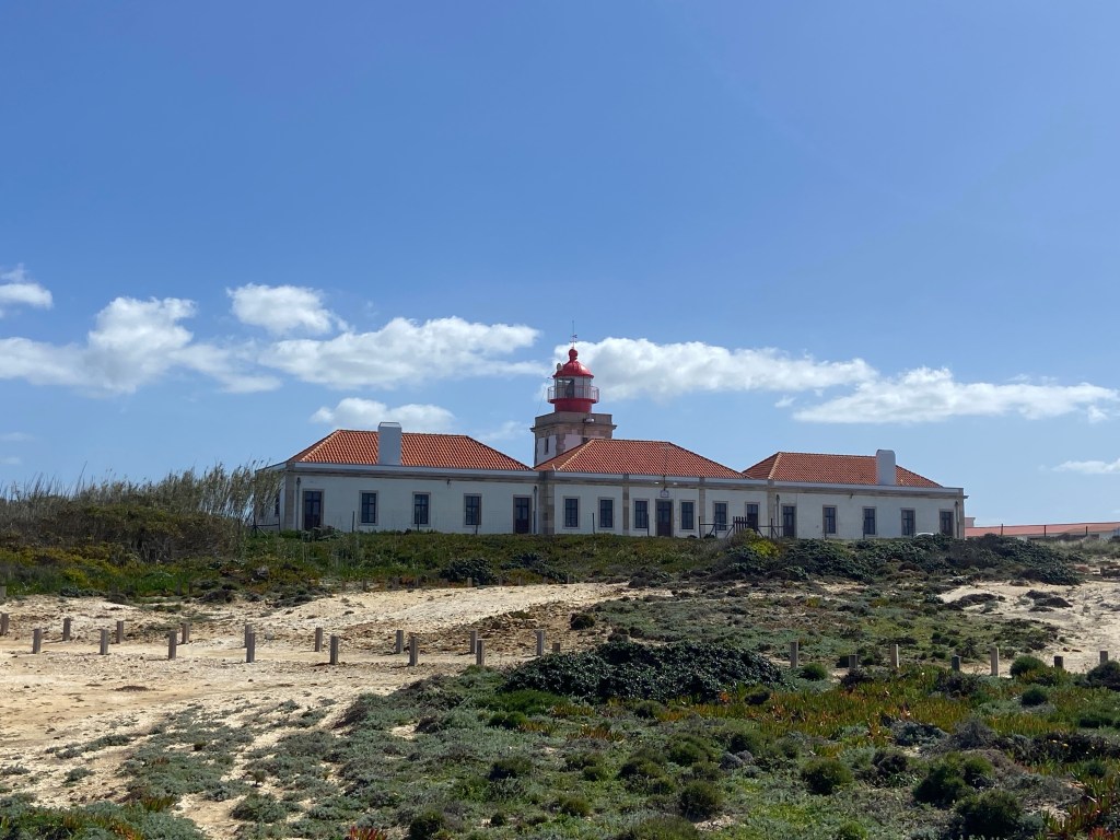 Nach kurzer Zeit führt uns der Weg jedoch wieder aus dem Wald heraus, an die Küste zur Praia do Cão. Hier ragen imposante Felszacken aus dem Meer empor. Es wirkt fast so, als würde hier ein Drache im Atlantik liegen. Auch der Leuchturm Cabo Sardão ist in der Ferne zu entdecken. Der Weg führt uns nun durch die kleine Ortschaft Cavaleiro, ehe wir den Leuchtturm erreichen. Störche haben hier ihre Nester kunstvoll an den felsigen Klippen errichtet. Noch sind keine Jungtiere zu sehen, aber die werdenden Eltern brüten bereits fleißig ihren Nachwuchs aus.