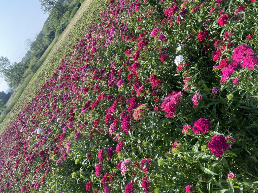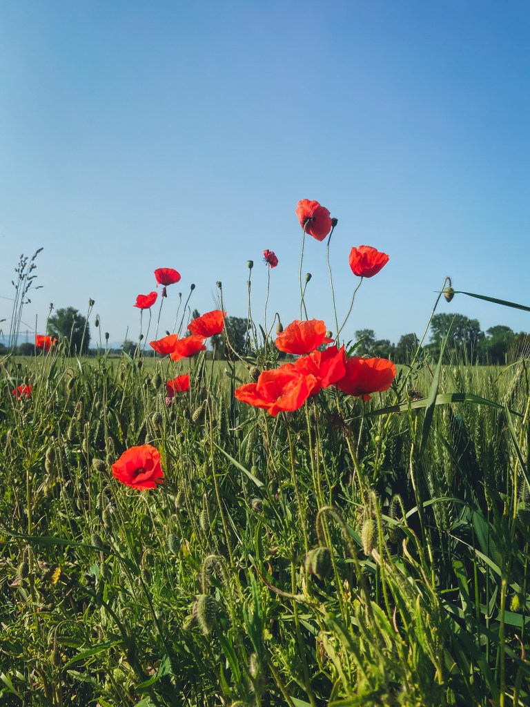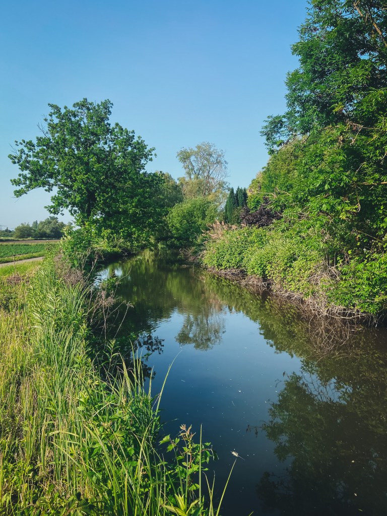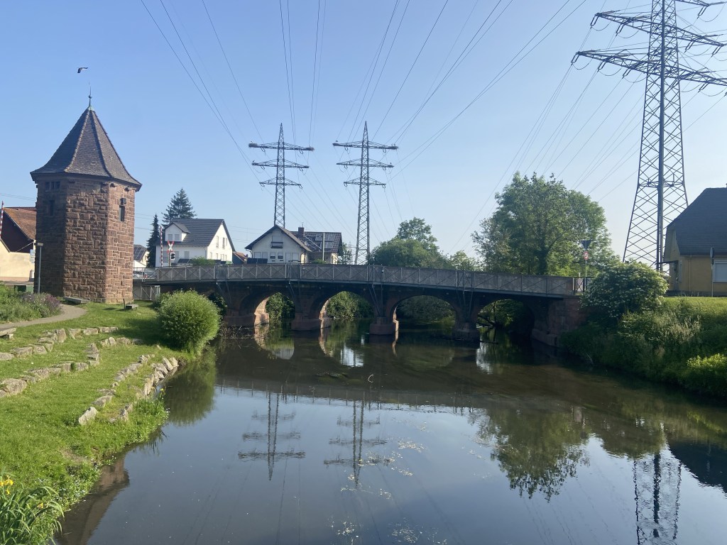 Nach ca. 25 Minuten kommen wir in Eichstetten an. Unsere Tour beginnt gleich am Bahnhof. Sofort sticht einem die Eichstetter Dreisambrücke, eine steinerne Fünf-Bogen-Brücke, das Wahrzeichens Eichstettens, ins Auge. Die Brücke wurde im Jahr 1784 errichtet und geht in ihren Fundamenten bis ins 16. Jahrhundert zurück. Unser Weg führt uns jedoch nicht über das historische Bauwerk, sondern auf eine hölzerne kleinere Brücke. Wir überqueren den Mühlbach und folgen dessen Verlauf in Richtung Westen. Auf linker Seite haben wir eine tolle Panoramasicht auf die Schwarzwaldkette inklusive Kandel, Rosskopf und Schauinsland. In den grünen Feldern finden sich immer wieder Mohnblumen, die farblich wunderschön hervorstechen.