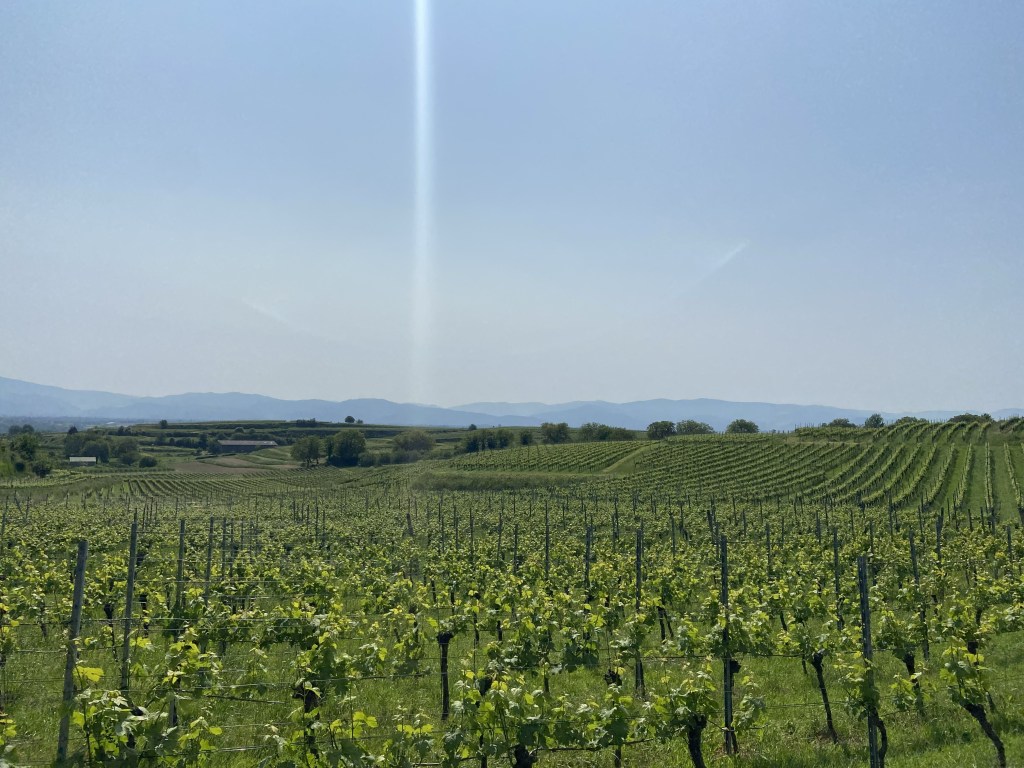 Am Wasserspielplatz biegen wir nun rechts ab und erreichen zügig das Weingut „Ambs“. Hier verlassen wir den „Brunnenpfad“ und folgen dem Weg mit der gelben Raute in Richtung Eichstetten Oberdorf. Wir passieren den Lerchenberg, einer 282m hohen Erhebung, welche ausschließlich mit Reben bestockt ist. Von hier oben hat man wieder eine tolle Sicht auf den Schwarzwald. Kreuzungen und Abzweigungen lassen wir links liegen und gehen immer geradeaus in Richtung Eichstetten.