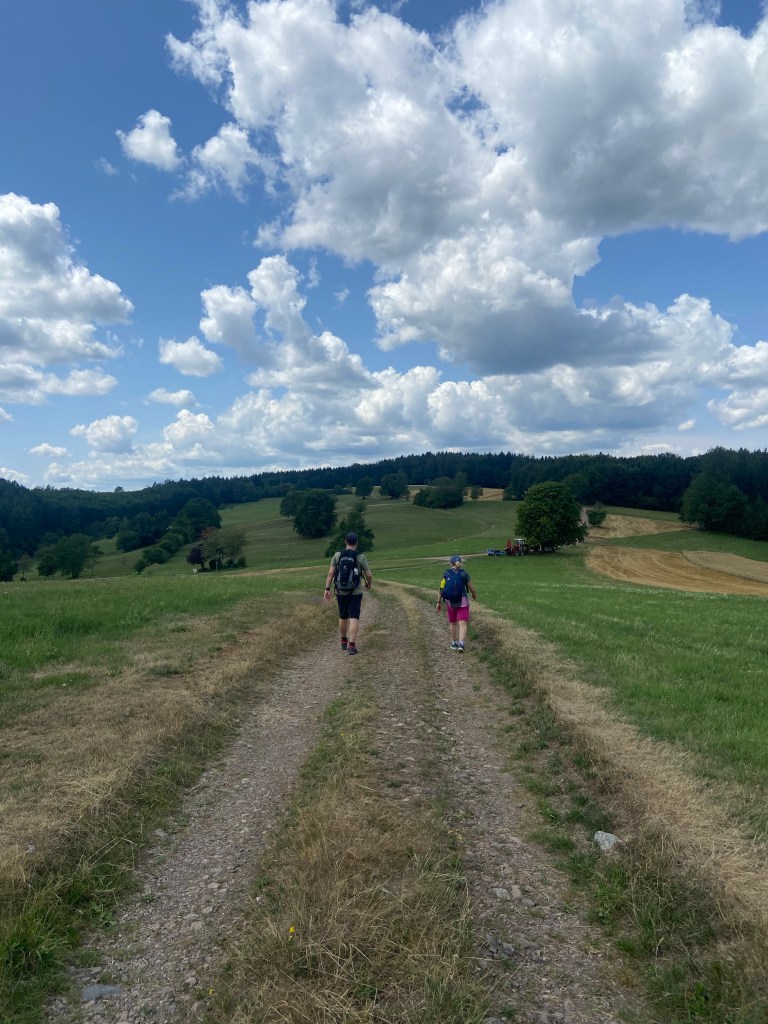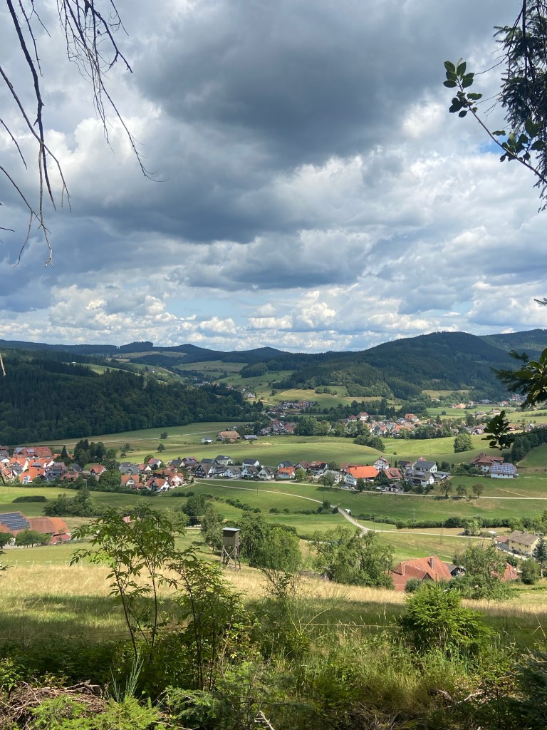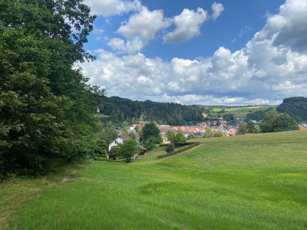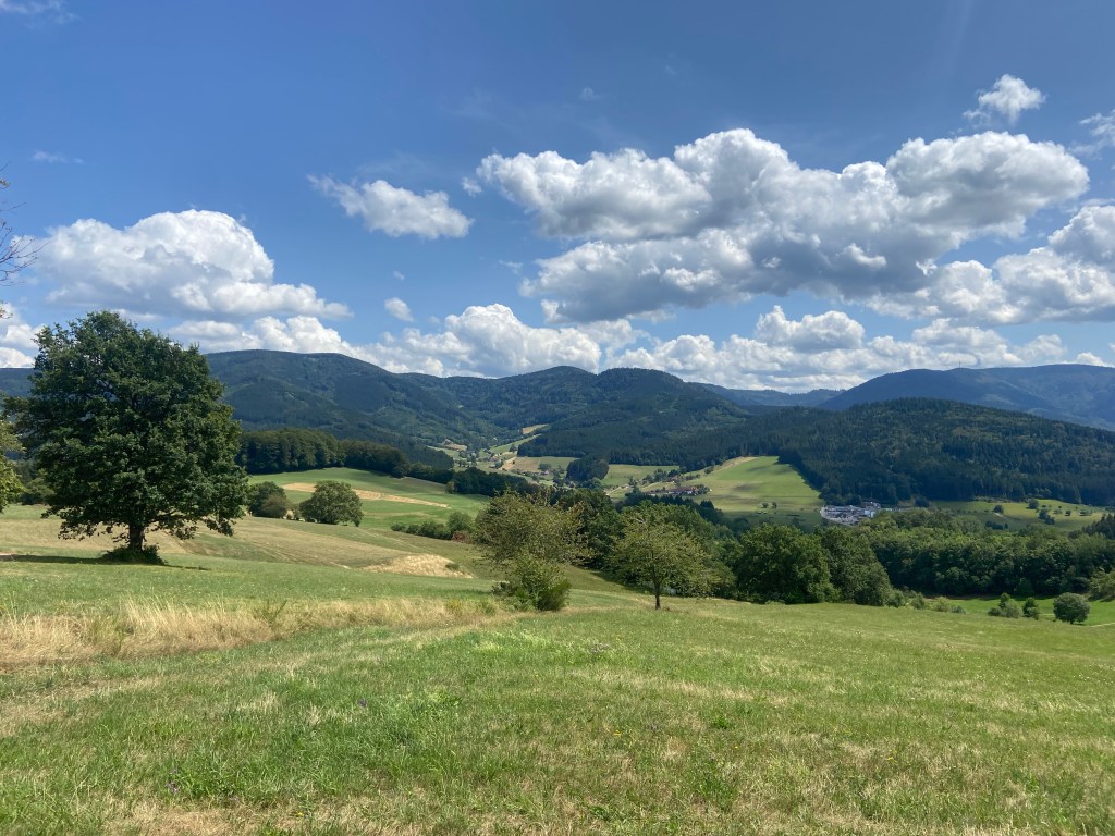 Mit dem Zug ging es von Freiburg an einem schönen sonnigen Sommertag los in Richtung Elztal. Die „Goldener-Kopf-Tour“ versprach herrliche Aussichten über das Elztal sowie ein ständiges auf und ab auf abwechslungsreichen Wegen. Wundervoll. Wir starteten unsere Tour am Bahnhof in Elzach und dort ging es auch gleich schon los mit dem Anstieg. Wir folgten zunächst der blauen Raute und ließen langsam aber sicher Elzach hinter uns. Am Ortsrand wurden wir schon von einer weitläufigen Wiese begrüßt, auf der wir zügig an Höhenmeter gewannen. Der Ort wurde langsam kleiner und die Aussicht schöner.