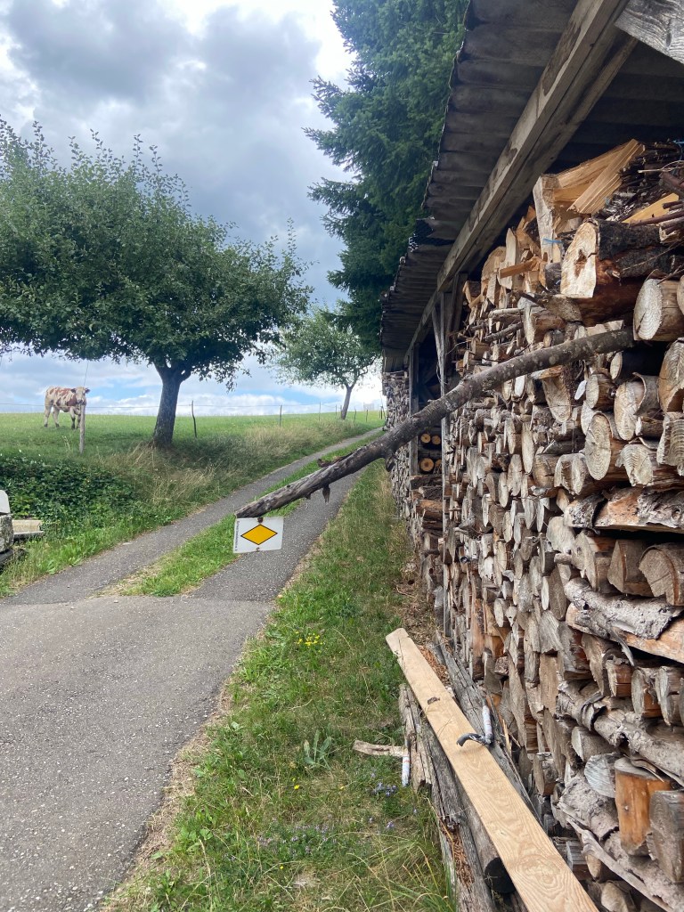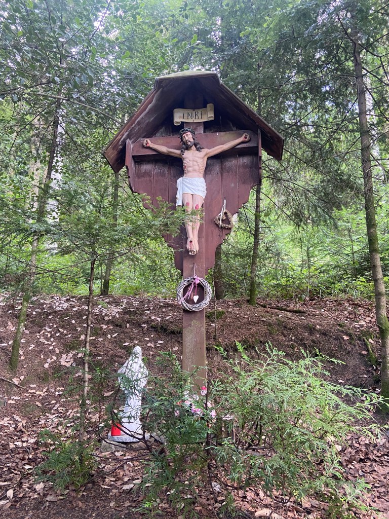 Am Blustweg erwartete uns noch ein schönes Christuskreuz und bald verließen wir den dichten Wald und wanderten durch weitläufige Wiesen hinunter in den Elzacher Ortsteil Reichenbach. Dort passieren wir das Gasthaus Richebächli, welches eine erste Möglichkeit zur Einkehr bietet. Jedoch ist es nach 3 gelaufenen Kilometern einfach noch zu früh für eine Einkehr, also setzten wir unseren Weg fort.