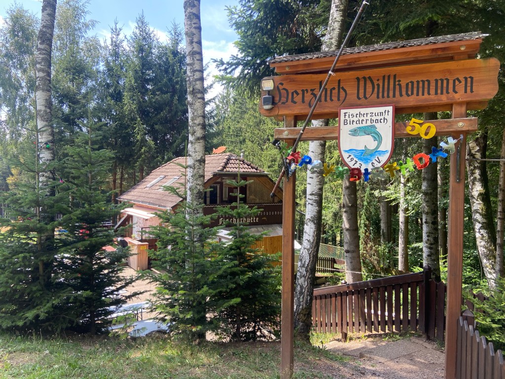 Nicht weit davon entfernt befindet sich die Fischerhütte Biederbach, mein ausgewähltes Ziel zur gepflegten Einkehr. Nach ca. 9 Kilometern in den Beinen ist dies genau der richtige Zeitpunkt. Die Fischerhütte Biederbach ist aus der 1973 gegründeten Fischerzunft hervorgegangen und verwöhnt nun Wanderer und andere Besucher, die ihre ruhige Lage zu schätzen wissen. Leider war genau an diesem Tag eine geschlossene Gesellschaft angekündigt, so dass die Fischerhütte für uns eigentlich nicht geöffnet hatte. Jedoch erlaubte uns das Servicepersonal, welches fleißig mit aufbauen beschäftigt war, ein Glas Sekt auf der Sonnenterrasse trinken zu dürfen. So konnte ich auf mein Jubiläum doch noch anstoßen. Die Fischerzunft hatte übrigens an diesem Tag ihr 50. Jubiläum zu feiern, ich glaube dass es dort abends richtig heiter zur Sache ging.