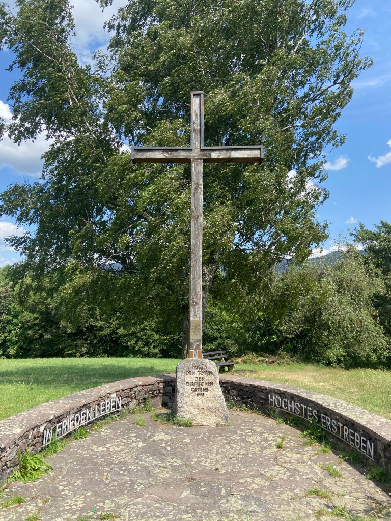 Ca. 100 Meter nach der Fischerhütte führt uns der Weg links in ein Waldstück zum Wegweiser „Wanne“, über das Bechererseck entlang der Goldenen Kopf-Hütte vorbei zum Goldenen Kopf. Am Goldenen Kopf steht ein großes Christuskreuz und man hat wieder mal eine tolle Sicht auf Elzach, welches nicht mehr allzu weit entfernt liegt. Das Christuskreuz ist eine Gedenkstätte für all jene, welche in den Jahren 1945 und 1946 durch den Beschuss der Alliierten ihr Leben verloren.