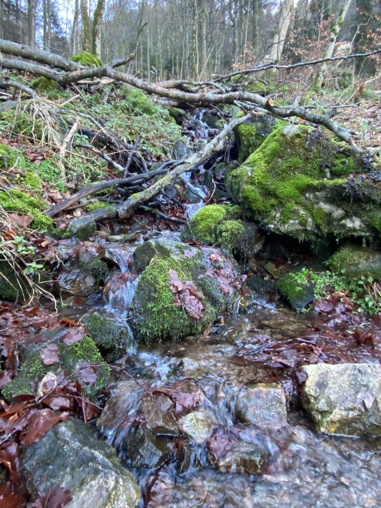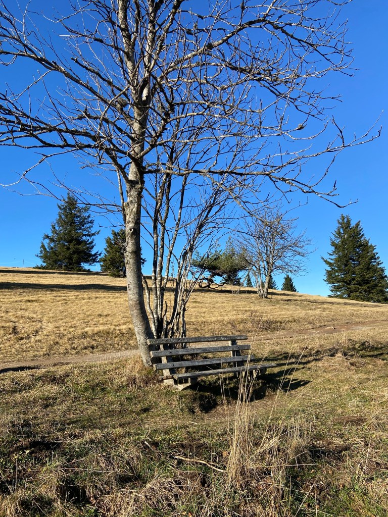 Nachdem wir die Aussicht auf uns wirken lassen haben, führt uns nun der Weg über den Parkplatz Kaibeloch und aussichtsreichen Wiesen leicht bergab zur Gummenhütte, welche auf 1.148 Metern liegt. An der Gummenhütte serviert der Fensterliwirt aus einem Fenster am Boden leckere regionale und saisonale Speisen und Getränke. Auch Übernachtungsmöglichkeiten sind vorhanden. Die Plätze in der warmen Januarsonne sind schon alle belegt und daher müssen wir leider auf die Bewirtung durch den Fensterliwirt verzichten und setzen unseren Weg gemächlich fort.