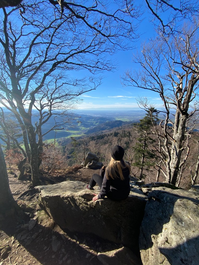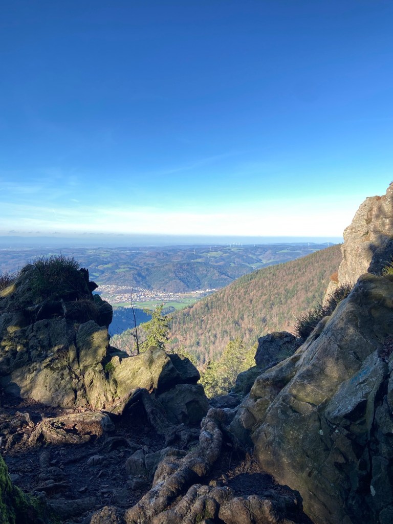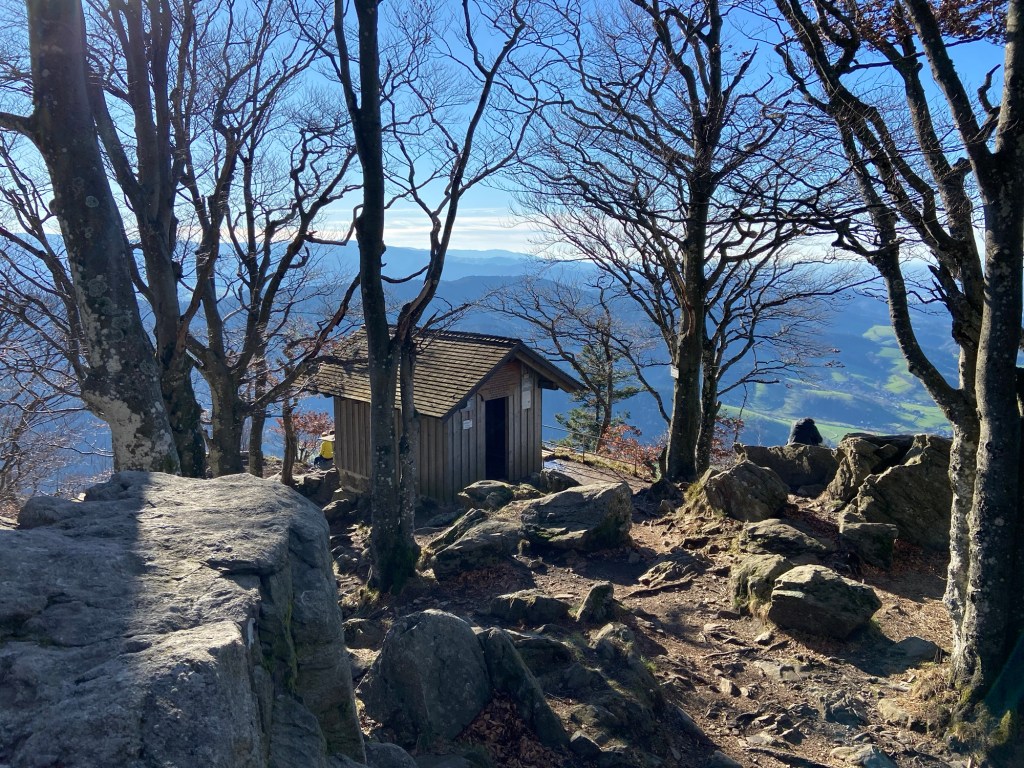 Der Weg führt uns nun auf gut begehbaren Waldwegen zur Thomashütte. Bei der Thomashütte handelt es sich um eine attraktiv gelegene, kleine Schutzhütte auf dem Kleinen Kandelfelsen. Sie gewährt eine erstklassige Sicht über das oberrheinische Tiefland bis zu den Vogesen. Auch hier merkt man das tolle Wetter, unzählige Wanderer und Spaziergänger versammeln sich auf den Bänken und Steinen rund um die Hütte und genießen die Sonnenstrahlen und ihr Vesper. Auch wir entscheiden uns, die Felsen für eine kleine Pause zu nutzen und versprechen, dass wir der Thomashütte mal unter der Woche einen Besuch abstatten werden, wenn es dort etwas ruhiger zugeht.