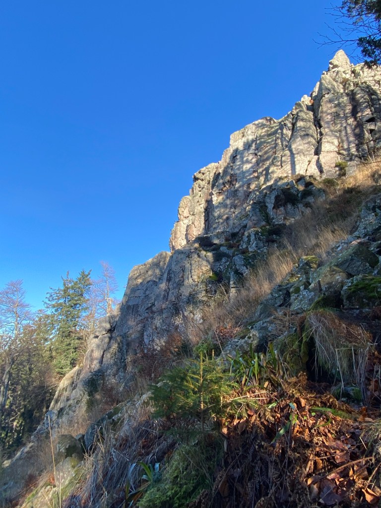 Von der Thomashütte geht es nun in Serpentinen leicht bergan in Richtung Großen Kandelfelsen. Auch heute finden sich zahlreiche Kletterer ein, um den senkrecht verlaufenden Felsen zu erklettern. Da wir von dem Anblick so fasziniert sich, verpassen wir den Weg und müssen nun durch ein kleines Geröllfeld direkt unterhalb des Felsens kraxeln. Ein leichtes Gefühl von Alpen überkommt uns.