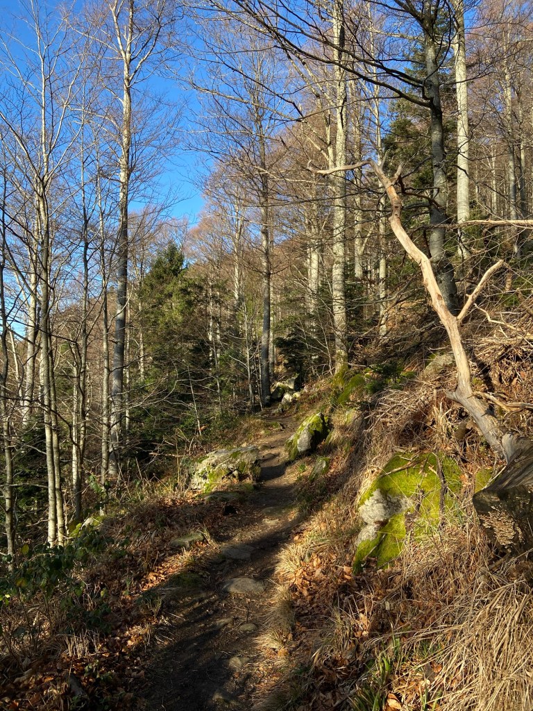 Von hier führt ein schmaler Bergpfad entlang des Steilhangs zum Heibererfelsen, einem weiteren Aussichtspunkt auf unserer Wanderung. Auf dem Teil der Tour sind wir ganz alleine, die Seite des Berges scheint, sehr zu unserer Freude, für gewöhnliche Spaziergänger nicht so interessant zu sein.