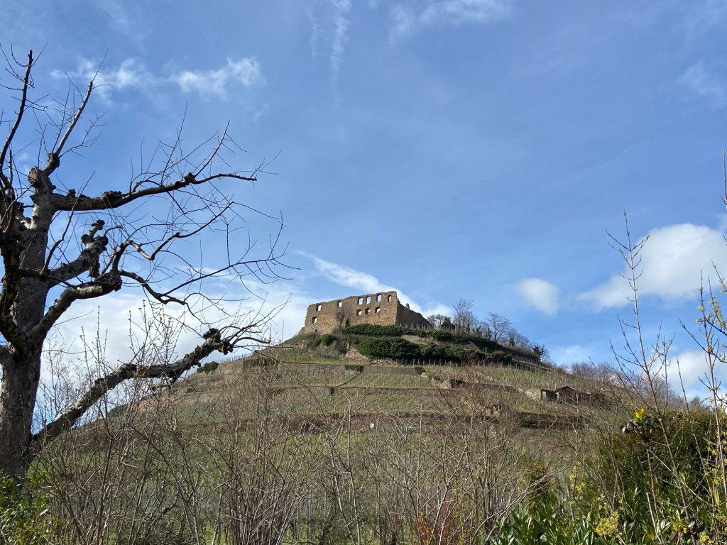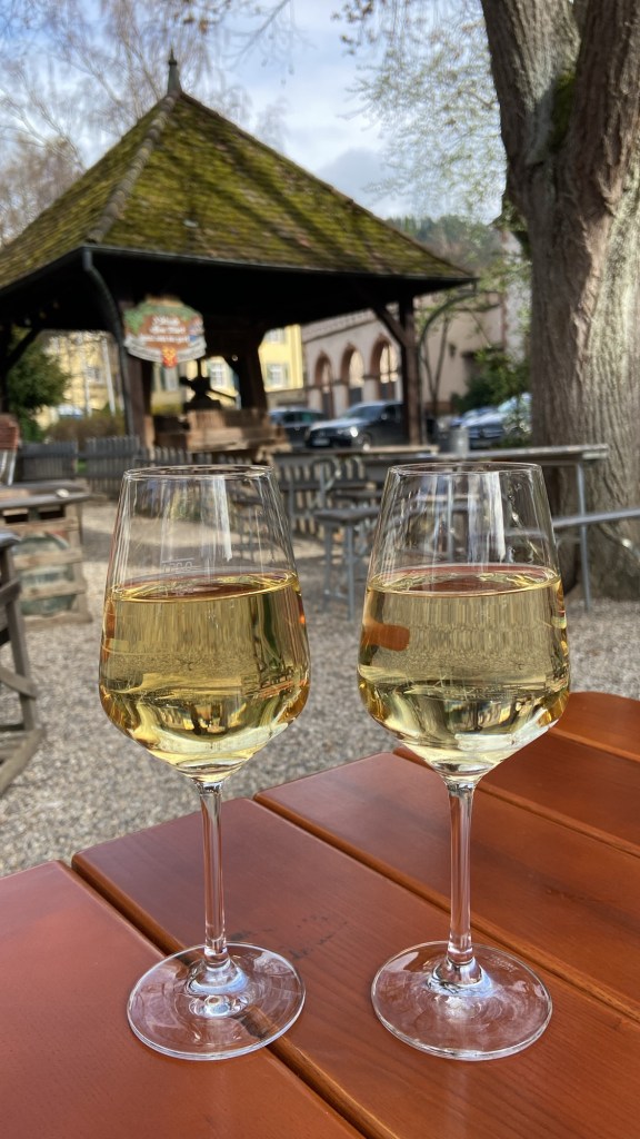 Eine Besichtigung der Burganlage sparen wir uns für die nächste Etappe des Wiiweglis auf, denn das Wetter zeigt sich gerade wieder von seiner besten Seite und wir wollen die Tour bei einem Glas Wein im schönen Stadtkern der Stadt Staufen abschließen, jedoch lassen wir uns es nicht nehmen, am Fuße der Burg entlang in die Stadt zu laufen. Zufrieden und vor allem trocken, setzen wir uns im Weinbrunnen des Weinguts Peter Landmann nieder und genießen ein kühles Glas Weißwein. Was für ein toller Abschluss.