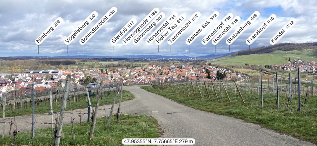 In Schallstadt am Bahnhof angekommen, orientieren wir uns in Richtung Weinberge. Die Reben befinden sich auf dem Batzenberg, einem 4 Kilometer langen, 1,2 Kilometer breiten Bergrücken. Der Batzenberg ist komplett unbewaldet, aber dafür vollständig mit Reben bepflanzt und stellt damit der größte geschlossene Weinberg und die größte geschlossene Gutedellage Deutschlands mit einer Anbaufläche von 376 Hektar dar. Vom Fuße des Batzenberges geht es für uns nun bergan in Richtung Sendemast. Auf dem Weg dorthin bietet sich uns ein toller Blick auf das in der Ferne liegende Freiburg und den Bergen des Schwarzwaldes dahinter.