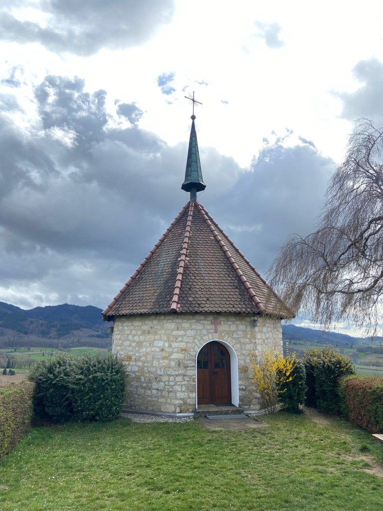 Von hier führt uns der Weg in den Ort, welchen wir jedoch nach kurzer Zeit schon wieder verlassen. Ebenso verlassen wir den Wiiwegli, um zur wunderschön gelegenen Ölbergkapelle zu kommen. Die Ölbergkapelle wurde 1954, zum Gedenken an die in den beiden Weltkriegen gefallenen Soldaten, erbaut. Im Innern der Kapelle befinden sich Tafeln mit Namen der Gefallenen und Vermissten, welche bei uns ein beklemmendes Gefühl hinterlassen. Schlimm muss es sein, nie erfahren zu haben, was mit seinem Liebsten passiert ist.