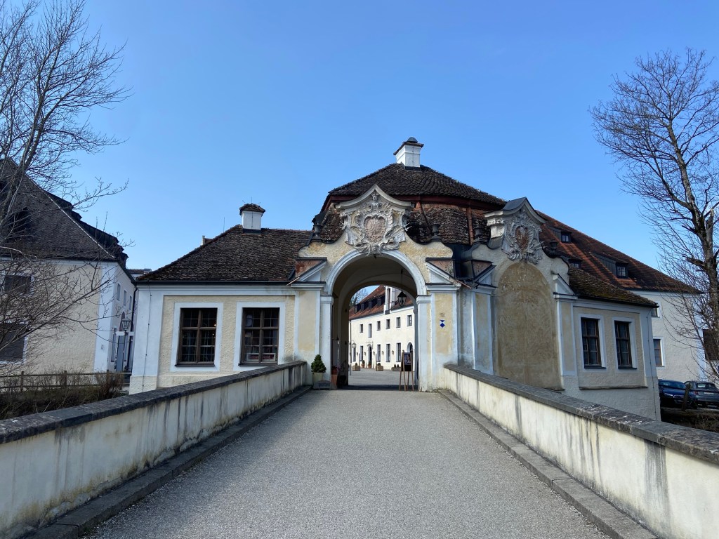 In Seefeld steigen wir einen steilen Treppenweg hinauf zum Schloss. Das erstmals 1302 erwähnte Schloss Seefeld ist seit Mitte des 15. Jahrhunderts im Familienbesitz der Grafen zu Toerring-Jettenbach. Im 18. Jahrhundert erhielt es seine heutige barocke Form. Über eine Brücke betreten wir den Schlosshof und schauen uns erst mal etwas um. Neben einem Bräustüberl befinden sich hier unter anderem auch ein Juweliergeschäft, ein Bekleidungsgeschäft und ein Kino.