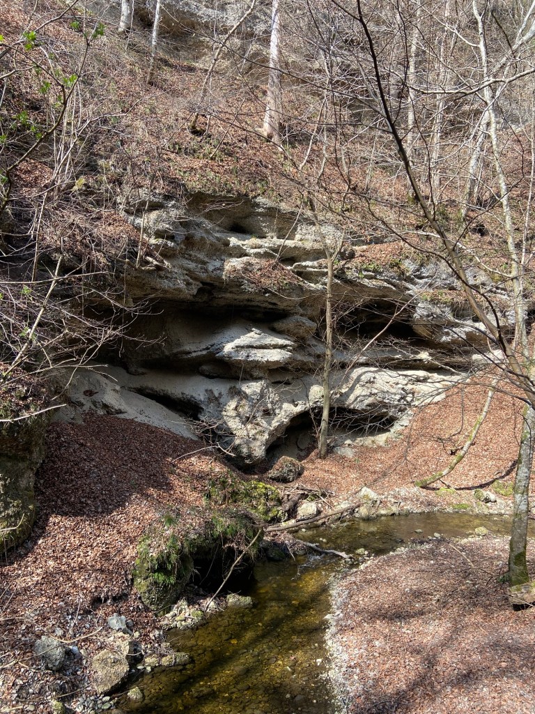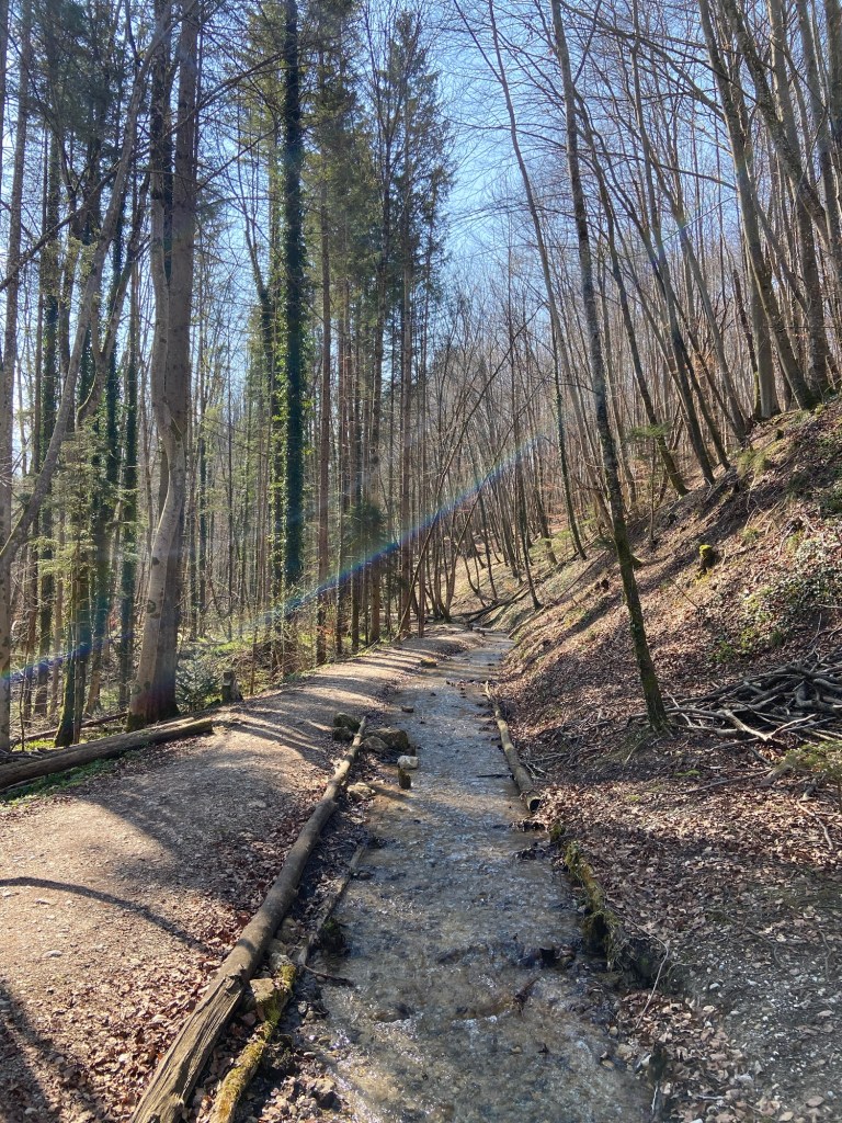 Wir verlassen den großzügigen Schlosshof und steigen auf einem Fußweg hinab ins waldige Tal des Höllgrabens. Auf einem schönen, schmalen Waldweg entlang des Baches geht es für uns nach Widdersberg und zum Widdersberger Weiher.