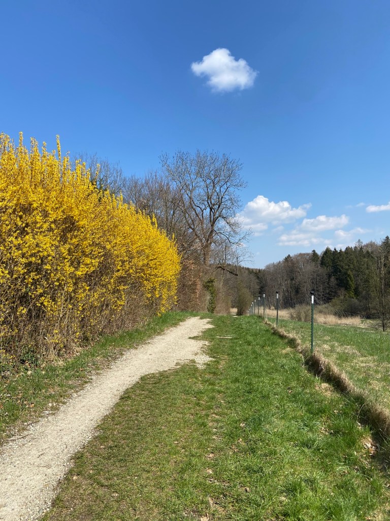 Unser erstes Etappenziel ist das Schloss Seefeld. Vom Bahnhof Seefeld-Hechendorf geht es hinab zur Seefelder Straße und entlang dieser in Richtung Ortschaft Seefeld. Schon auf den ersten Metern merken wir, dass sich die Natur hier teilweise noch im Winterschlaf befindet. Zarte Pflanzentriebe oder erste Frühlingsblumen, wie wir sie bereits in Freiburg schon gesehen haben, sind hier rar.