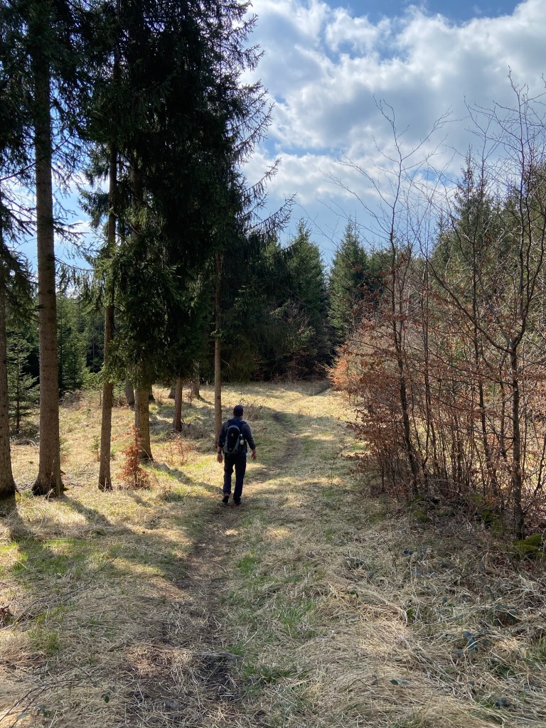 Wir queren die Verbindungsstraße Herrsching-Frieding und kommen langsam in einen Wald. Der Weg verläuft hier etwas „orientierungslos“ über einen Geländerücken und anschließend ca. 3 Kilometer über einen Höhenzug. Es ist angenehm still im Wald und kein anderer Wanderer begegnet uns. Wir wandern schweigend nebeneinander her und genießen die Natur.