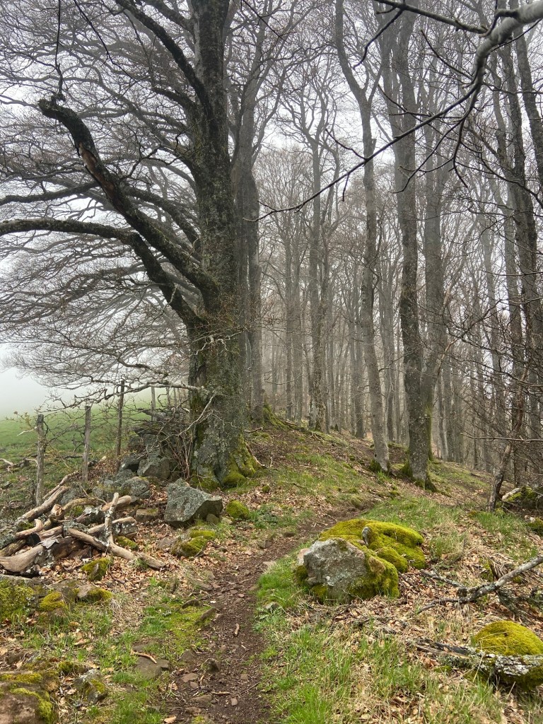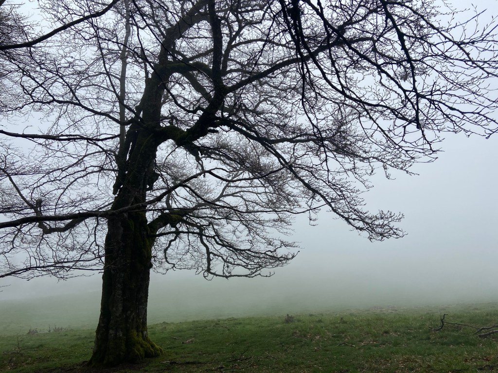 Am Wanderparkplatz führt uns links ein schmaler Pfad direkt in den Wald hinein, in dem wir steil den Berg hinaufgehen. Nach ca. einem Kilometer kommen wir an eine Wegverzweigung, an der wir die Schützhütte des Skiclubs Cernay auf linker Seite entdecken können. Wir ignorieren die Abzweigung und folgen dem schmalen Pfad weiter gerade aus. Im Tal bei Wattwiller strahlte die Sonne noch in ihrer vollen Kraft. Hier, ca. 650 Höhenmeter weiter oben, umgibt uns dichter Nebel. Die Luft ist klar und duftet nach feuchtem Waldboden, welcher mit Laub und Moos bedeckt ist.