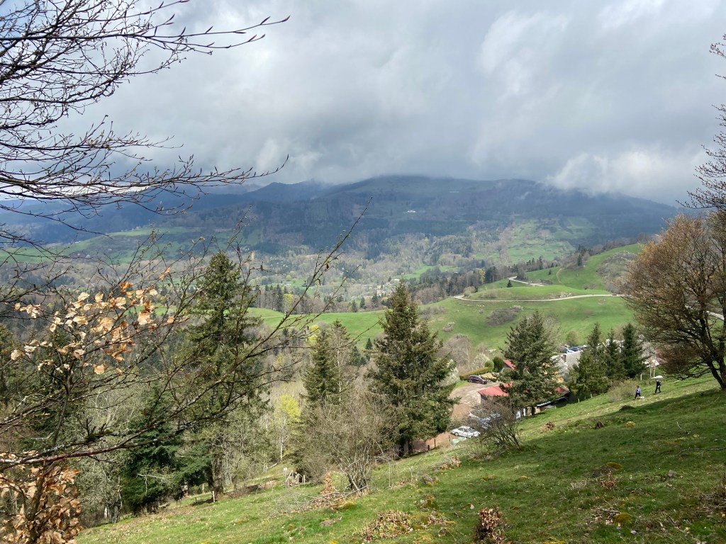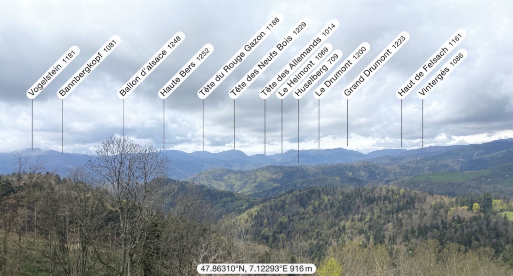 Ab dem Berggasthof nehmen wir den mit dem roten Dreieck markierten Weg und folgen diesem ca. 1,5 Kilometer lang leicht bergabwärts. Wir gelangen nun zu einer unscheinbaren Verzweigung. Wir verlassen die breite Forststraße und biegen links auf einen schmalen Pfad ab. Der Pfad führt uns durch einen lichten Wald bergauf, bis wir nach ca. einem Kilometer an einem Aussichtsfelsen ankommen. Um die schöne Aussicht genießen zu können, ist leichte Handarbeit gefragt. Oben angekommen erwartet uns eine tolle Aussicht auf die bergige Landschaft der Vogesen und deren Gipfel, unter anderem Rossberg, Ballon d’alsace, Tête du Rouge Gazon und selbstverständlich den Grand Ballon. Bei einem Blick ins Tal findet man die Ferme-Auberge Ostein. Wir nutzen die Aussicht für eine kleine Rast und bekommen Gesellschaft von einem Einheimischen, der mit Freude über die Umgebung berichtet.