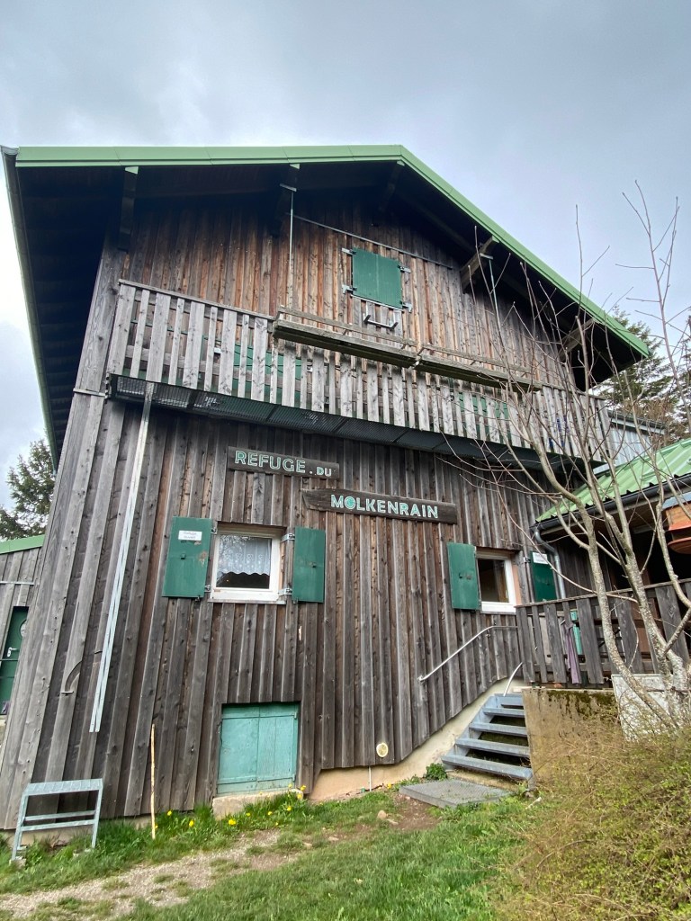 Die hölzerne, bewirtschaftete Schutzhütte mit ihrer gemütlichen Terrasse lädt die Besucher zum Verweilen ein. Das lassen wir uns nicht zweimal sagen und bestellen beim sympathischen Betreiberpaar Wein, Bier und Kaffee. Die sprachliche Barriere wissen die Wirte gekonnt zu überwinden: Mit Gesten, ein paar Wörtern Deutsch ihrerseits und etwas Franzöisch unsererseits, stehen die Bestellungen schnell auf dem Tisch. Bei kühlen sowie warmen Getränken und angeregten Gesprächen regenerienen sich unsere Kräfte zunehmends. Inzwischen finden sich auch andere Gäste auf der Terrasse ein. Ein kurzer Blick auf ihre Bestellungen und deren glücklichen Gesichter lässt den Gedanken zu, dass auch die Kuchen im Refuge du Molkenrain ausgezeichnet sein müssen. Wir wären gerne noch ein Weilchen sitzen geblieben, jedoch lässt ein Blick in den Himmel zum Weitergehen aufbrechen.