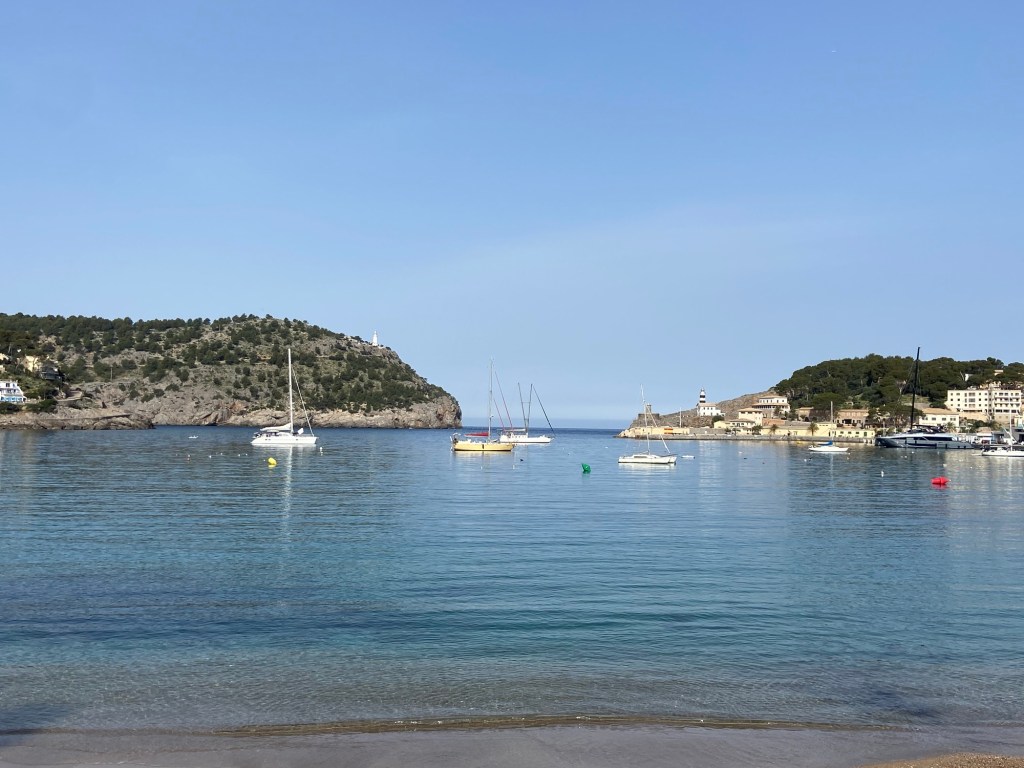 Wir beginnen unsere Wanderung kurz nach einem ausgiebigen Frühstücks am Bahnhof von Port de Sóller. Wir folgen den Schienen zur Strandpromenade Platja den Repic. Um die Uhrzeit ist es ruhig im Küstenort, nur wenige Menschen sind schon auf den Beinen und so können wir den Blick auf den menschenleeren Strand und die große Bucht richtig genießen.