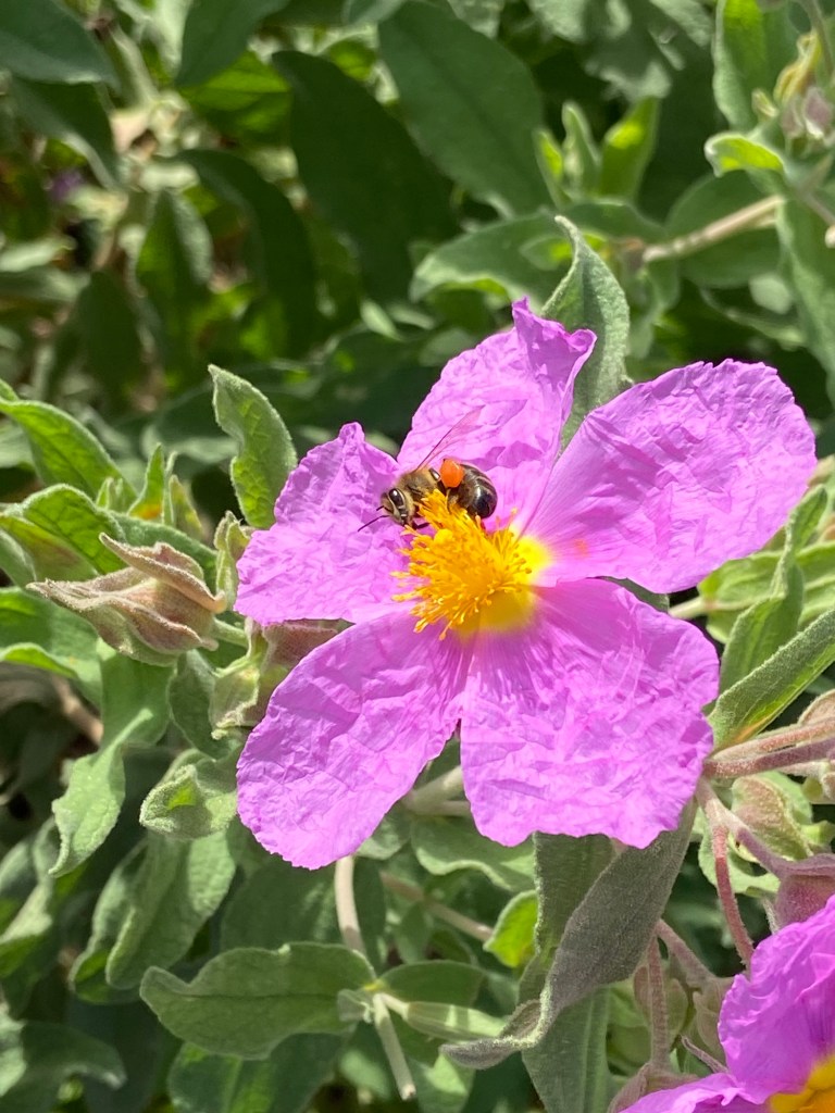 Der Pfad zieht sich nun entlang der Felsenküste und dem türkisgrünem Meer. Auch hier ist der Weg unübersichtlich, daher halten wir regelmäßig Ausschau nach den roten Farbpunkten, welche den Weg markieren. Nach ca. 20 Minuten erreichen wir einen kleinen Rastplatz. An einem Steintisch unter Aleppokiefern genießen wir, bei Sicht aufs Meer, ein kleines Vesper und tanken unsere Energiespeicher auf.