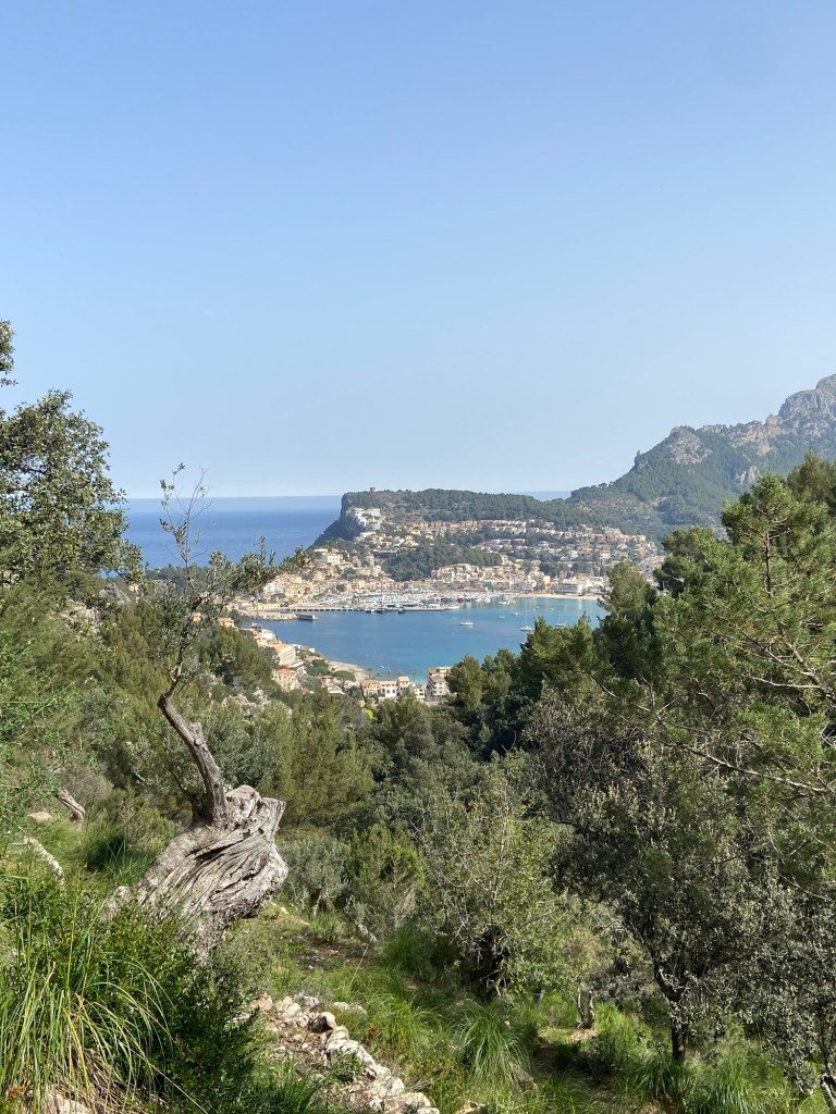 Der Weg führt leicht bergauf durch einen lichten Wald, welcher langsam in einen Olivenhain übergeht. Über knorrige Ölbäume hat man einen wunderschönen Blick auf Port de Sóller.
