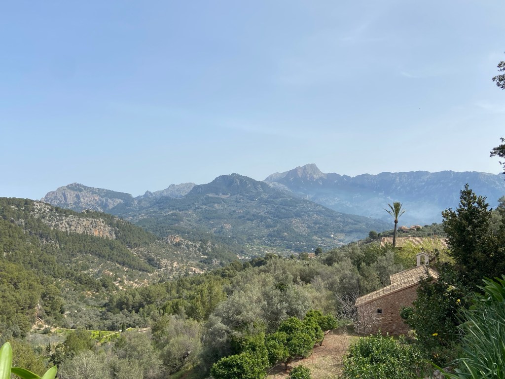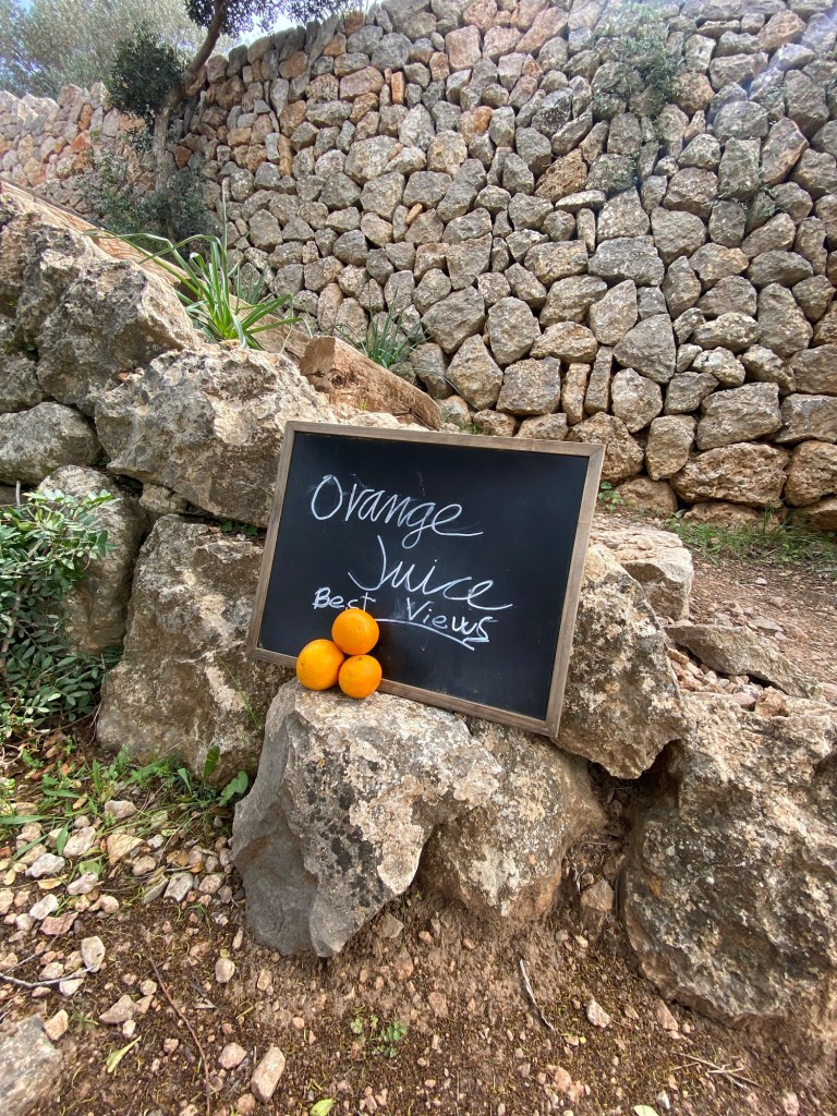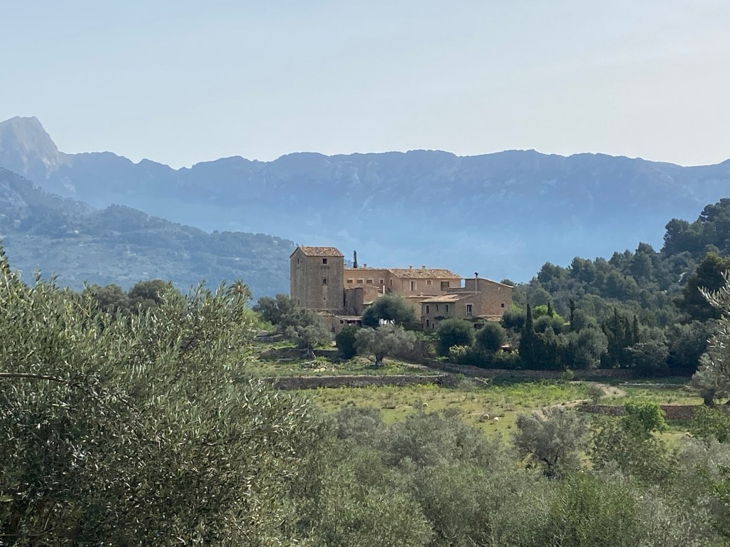 Wir bleiben weiter auf dem GR221, welcher bei einer Villa von einem Erdweg in ein Asphaltsträßchen übergeht. Dieser folgen wir, bis wir zur Ma-10 ankommen. Auf dieser gehen wir ca. 150 Meter bis zum Hotel Corazon und biegen dann rechts auf einem breiten Weg ab. Nach weiteren ca. 50 Metern halten wir uns geradeaus und kommen nun zur Capella de Castelló. Dort biegen wir rechts ab und gehen zur Finca Son Mico. Auf der aussichtsreichen Terrasse hat man erneut einen traumhaften Blick auf die Serra de Tramuntana. Ebenso lädt die Terrasse zu einer Rast ein, denn in der Finca gibt es frischen Orangensaft und Zitronenkuchen.