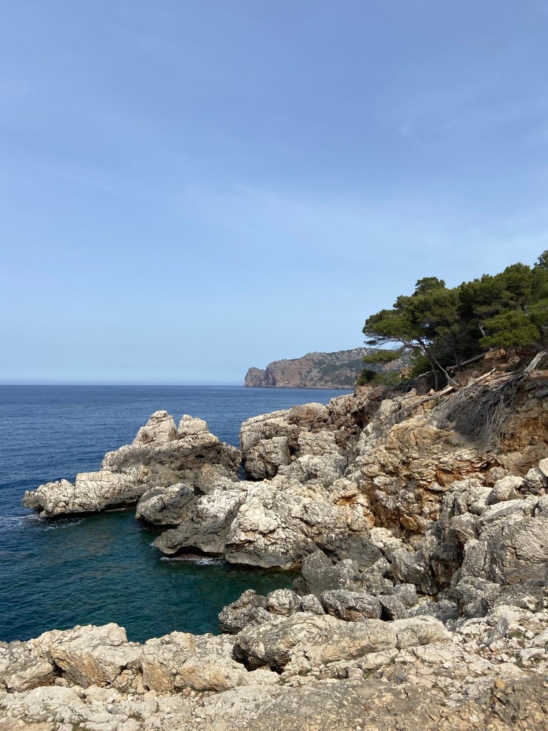 Immer der Steilküste folgend, kommen wir nun zur Cala de Deià. Die kiesige Bucht ist trotz Nebensaison gut besucht. Das sonnige Wetter und das glasklare Wasser lädt die Besucher zum Baden und Verweilen ein. Ich strecke meine Hand ins Wasser und bin erstaunt, dass das Meer in der Bucht bereits Mitte März angenehm warm ist.