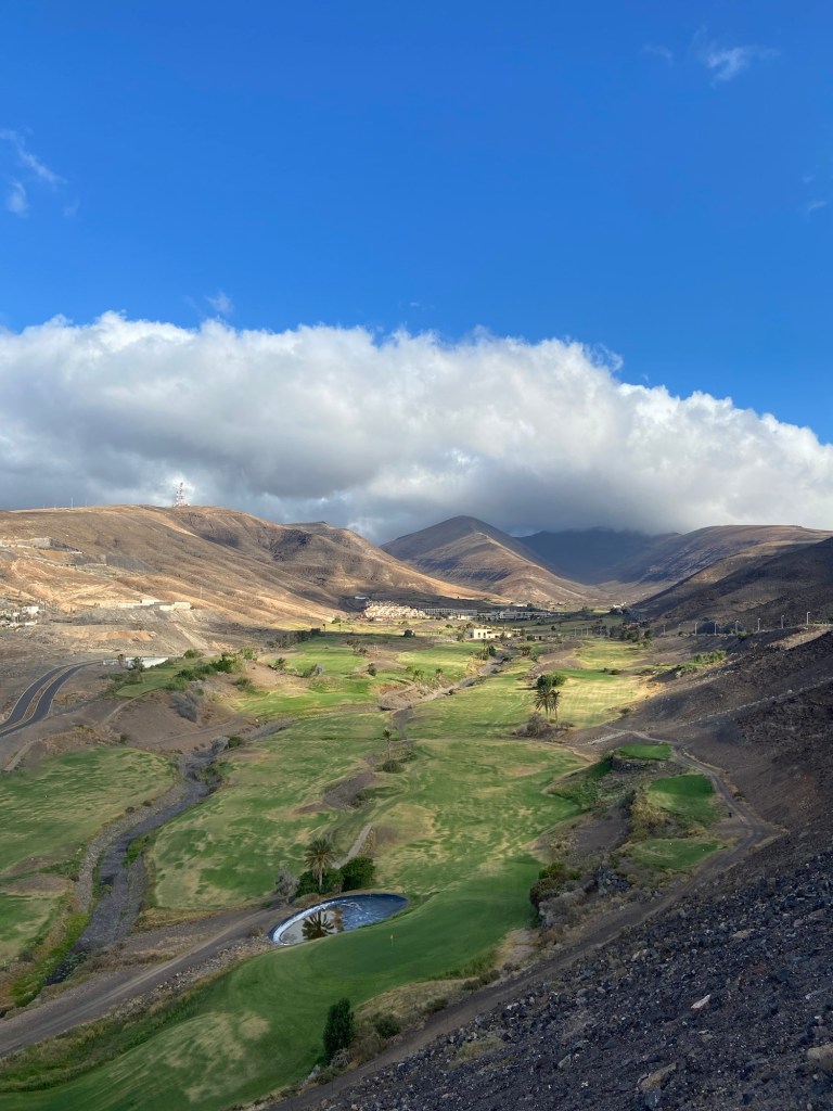 Dennoch lassen wir uns von unseren Plan einer Gipfelbesteigung nicht abbringen und starten unsere Wanderung am Parkplatz des Ventura Shopping Centers. Am Kreisverkehr, unmittelbar in der Nähe des Burger Kings, biegen wir links in die Calle el Quijote ab. Nach ca. 250 Meter biegen wir erneut links auf die Calle Sancho Panza ab. Sobald wir das Hotel Barceló Jandía Playa passiert haben, schwenkt die Straße nach rechts und eröffnet einem erste Aussichten auf den weiten Strand und die unzähligen Hotelanlagen Morro Jables. Wir folgen der Straße in Richtung Wasserreservoir Tanque Agua für ca. 3 Minuten und biegen dann rechts ab.