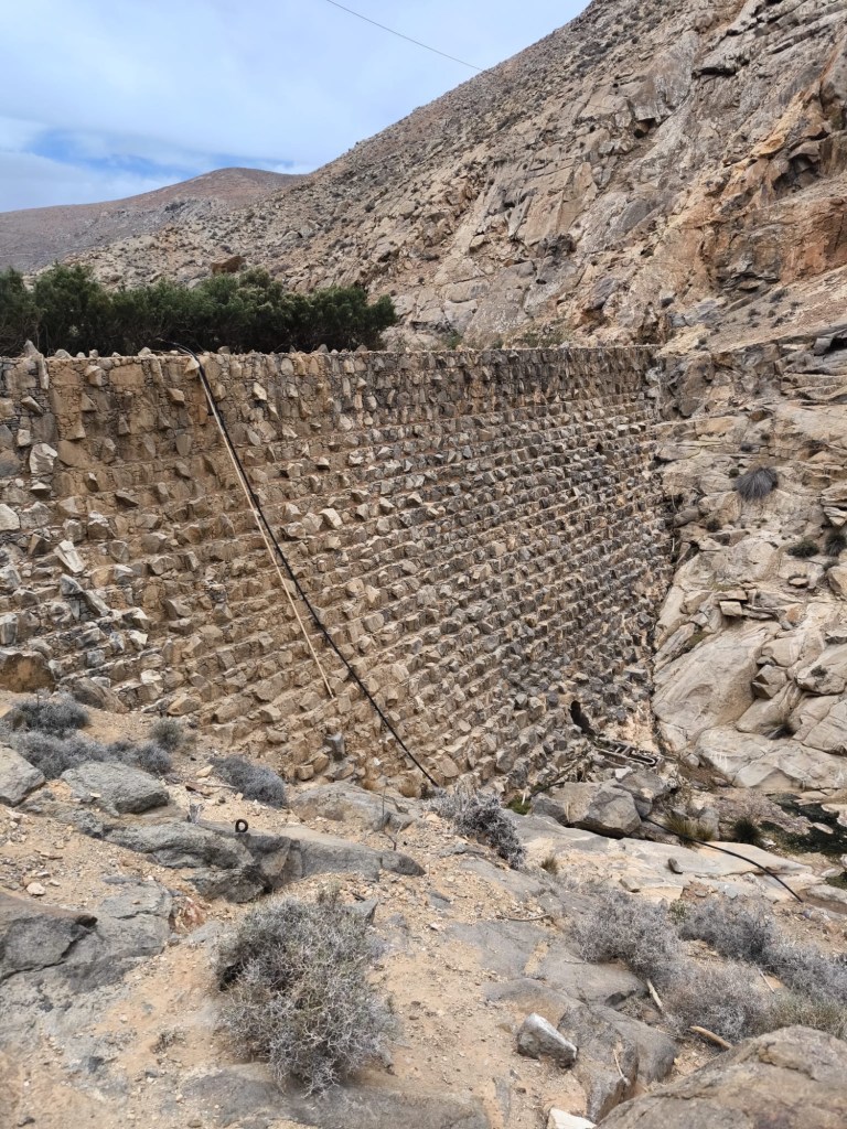 Am Staudamm angekommen, erleben wir eine grandiose Aussicht in das Schluchtbett des Barrancos. Die Sicht in den v-förmigen Schluchtausgang ist mein persönliches Highlight der Wanderung. Ebenfalls sehenswert ist der Staudamm, der Presa de las Peñitas, selbst, unterscheidet er sich doch in der Bauweise her von den typischen Staumauern aus Beton. Oberhalb der Staumauer erhebt sich zudem der Pico de la Muda in den Himmel, was ein weiterer schöner Anblick darstellt.