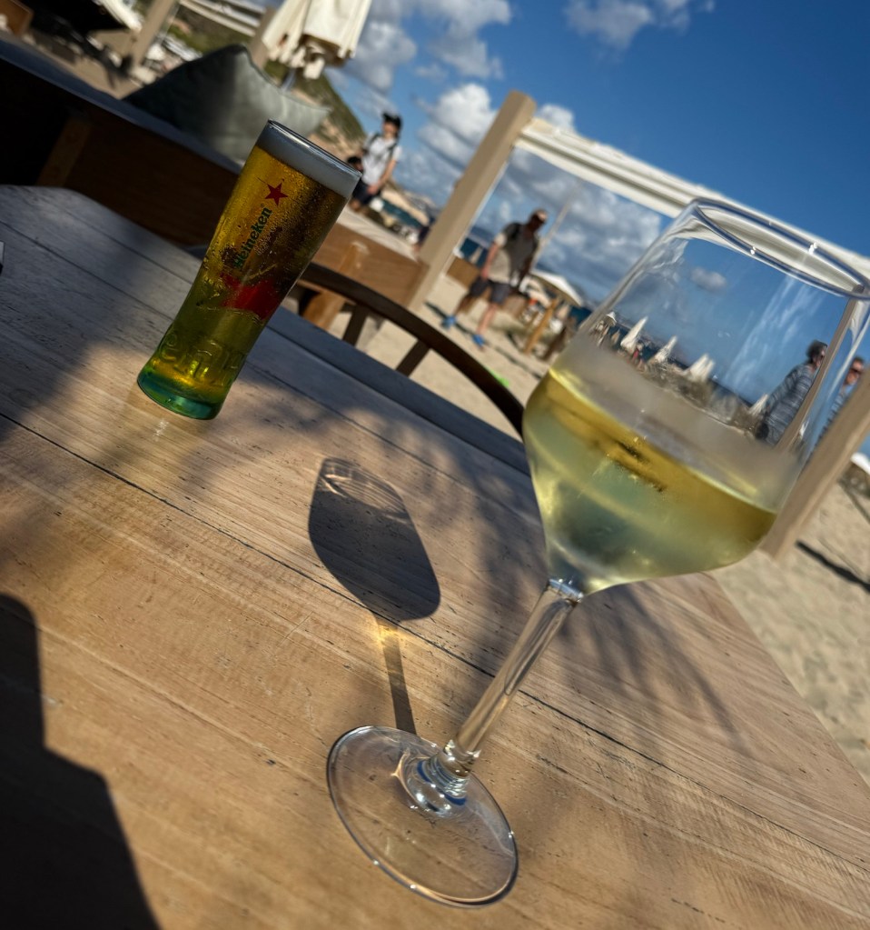 Ab hier ist der Wegverlauf zur Platja des Cavallet kaum zu erkennen. Als Wanderer erahnt man diesen eher und wir müssen uns bei der Suche nach dem Weiterweg durch das Unterholz etwas konzentrieren. Es folgt ein kräftiger Anstieg und wir erreichen eine geteerte Straße, welche bereits zur Ortschaft Es Cavallet gehört. Wir folgen der Straße kurz bergabwärts und verlassen diese bereits nach der ersten Kurve. Auf linker Seite führt ein schmaler Pfad hinab zum Restaurant La Escollera, welches sich am nördlichen Ende der Platja des Cavallet befindet. Am Strand entlang kommen wir nach ca. 200 Meter zum Beachclub El Chiringuito. Dort kehren wir für eine Pause ein und genießen nicht gerade preiswerte, aber angenehm kühle Getränke.