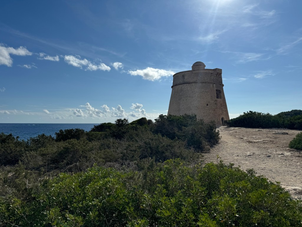 Am südlichsten Abschnitts des Strandes lassen wir langsam den Trubel und die Hotelanlagen hinter uns und steigen leicht die Küste hinauf zum Torre de sa Sal Rossa. Der auch unter dem Namen Torre des Carregador bekannte Turm, ist ein Wehrturm aus dem 16. Jahrhundert. Zum damaligen Zeitpunkt war die Bevölkerung von Ibiza häufigen und blutigen Überfällen von Barbaresken-Korsaren ausgesetzt und beschloss daraufhin den Bau von Befestigungsanlagen, insbesondere um die Gewinnung und Verschiffung von Meersalz zu sichern. Der Turm sollte gleichzeitig als Beobachtungs- und Wehrturm, hauptsächlich aber als kollektiver Zufluchtsort für die Arbeiter in den nahen Meerwassersalinen und die Bevölkerung des Plan de Sant Jordi, eines der wichtigsten landwirtschaftlichen Gebiete der Insel, dienen.
