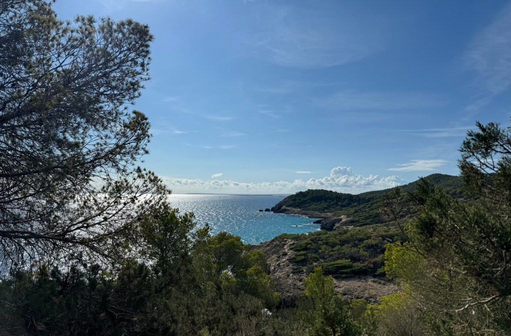 Auf der Landzunge können wir durch die Bäume die Platja des Cavallet, unser Wanderziel erspähen. Zudem reicht der Blick zum Torre de ses Portes an der Südspitze von Ibiza und der Insel Formentera.