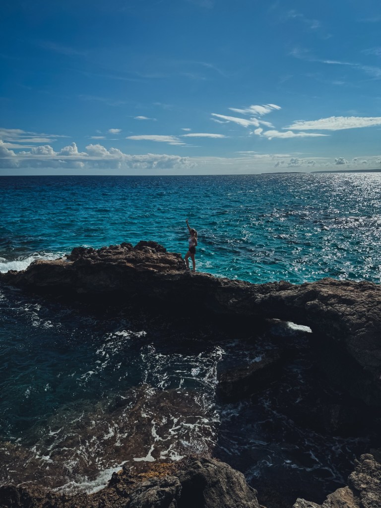 Hinter dem Torre de sa Sal Rossa geht es für uns hinab zu ein paar Bootsgaragen. Ein Pfad bringt uns über die Uferfelsen zu weiteren Bootshäusern am Ende der Bucht. Hinter den Bootshäusern führt ein schmaler Pfad steil auf eine Anhöhe hinauf. Auf der Anhöhe eröffnet sich uns ein wunderschöner Blick über die Küste der Insel.