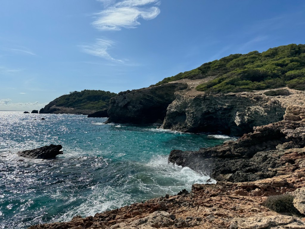 Wir ignorieren einen schmalen Pfad, welcher nach rechts führt und gehen den Weg weiter geradeaus. Wir schlängeln uns entlang eines kaum markierten Küstenpfads, welcher uns im kräftigen Auf und Ab durch den Uferhang zur Punta des Corb Mari führt.