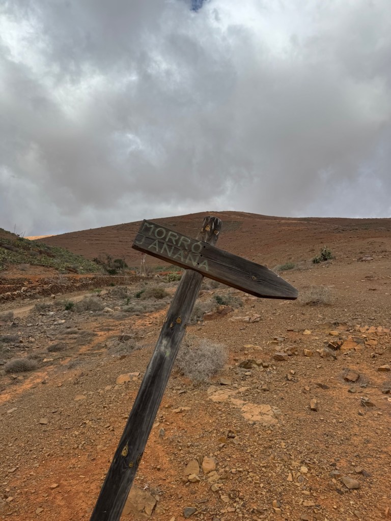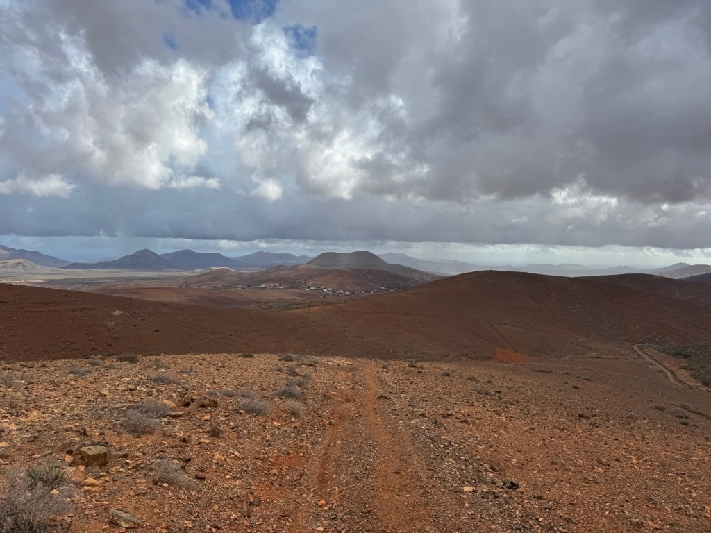 Der inzwischen gut sichtbare Weg läuft nun in einen Sattel hinab. Der Wind pfeift uns, typisch Fuerteventura, kontinuierlich um die Ohren. An Überhitzung leiden wir auf jeden Fall nicht, als wir über einen weiteren Sattel hinauf zum Gipfel des Morro Janana aufsteigen. Ein aufkommender Regenschauer versperrt uns die großartige Aussicht rund um die Sendestation, so dass wir erst gar nicht zu ihr hinlaufen.