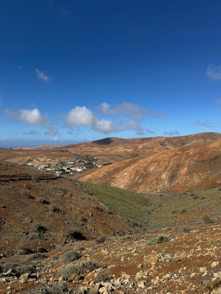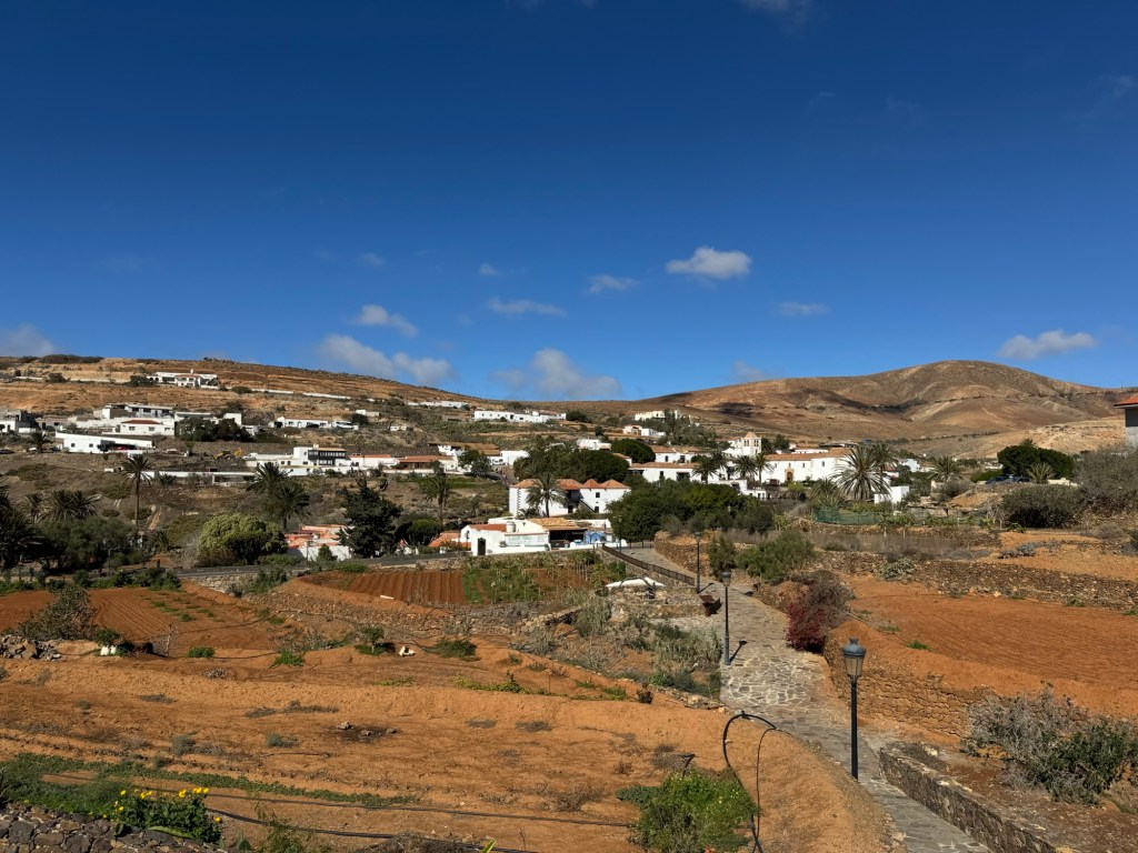 Nach einer kurzen Pause steigen wir wieder zum Wasserhaus hinab. Dort angekommen, halten wir uns rechts und folgen einem steilen und gerölligen Weg in das Kerbtal Majada de la Perra. In der Talsohle angekommen, können wir bereits die Kirche von Betancuria entdecken. Wir passieren die Klosterruine San Buenaventura, welche sich auf rechter Seite des Weges befindet. Von dort führt uns eine kleine Teerstraße zurück in den malerischen Ortskern von Betancuria, wo wir die Tour beenden und die Zeit mit etwas Sightseeing verbringen.