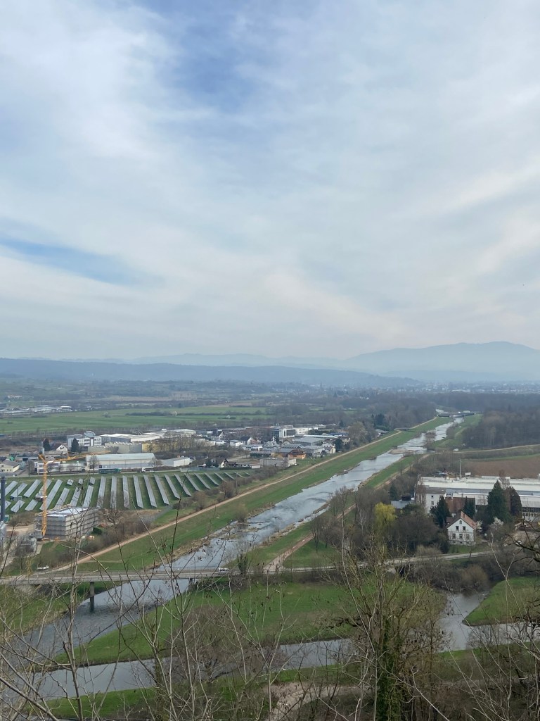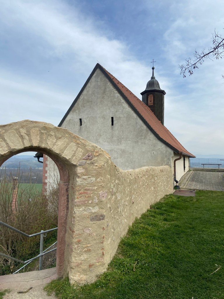 Wir überqueren die Elz und steigen am Parkplatz der Kunsthalle Messner zur Michaeliskapelle hinauf. Ein schmaler Pfad führt uns in spitzen Kehren den Berg hinauf. Oben auf dem Michaelsberg angekommen bietet sich eine tolle Sicht auf die Rheinebene, dem Schwarzwald und den Vogesen. Neben der tollen Sicht kann man auch das Wahrzeichen der Ortschaft Riegel besichtigen. Die Michaeliskapelle wurde im Jahr 969 n. Chr. erstmals in einer Urkunde des Klosters Einsiedeln in der heutigen Schweiz genannt. Im 12. Jahrhundert war die Michaelskapelle die Burgkapelle der Burg Riegel und wurde in die damalige Festung integriert. Nach der Zerstörung der Burg im 14. Jahrhundert entstand im 15. Jahrhunderts das heutige Aussehen der Kapelle mit dem spätgotischen Chor. Im 18. Jahrhundert war der 243 Meter hohe Michaelsberg und seine Kapelle ein beliebter Wallfahrtsort.