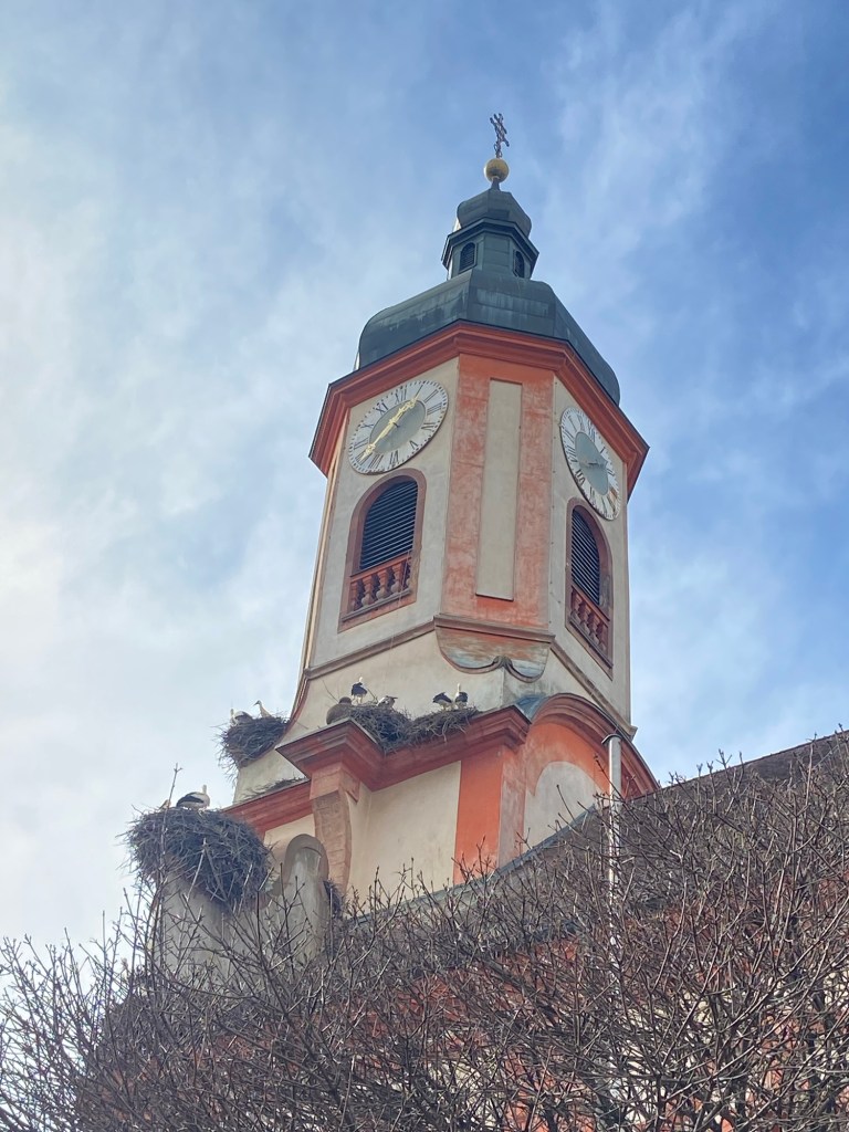 Von der Kapelle fürht unser Weg durch Lösswände und Hohlwege hinab in Richtung Ortskern. Wir passieren ein Wohngebiet in dem die gut gepflegten Gärten bereits in allen Farben strahlen. Da bleibt es nicht aus, dass man des öfteren stehen bleibt, um die ein oder andere Blume oder Blüte zu fotografieren. Wir folgen dem Wanderweg, der durch den Ort und entlang zahlreicher historischer Gebäude mit Bezug zur Brauerei, führt und gelangen zur Kirche St. Martin. Auf den Dächern der barocken Kirche sowie in der Nachbarschaft finden sich zahlreiche Storchennester. Das Geklapper der Störche erfüllt die Luft und man kommt beim Zählen der Nester kaum nach. Ein wirklich imposanter und freudiger Anblick, welcher unser Lächeln im Gesicht noch weiter verstärkt.
