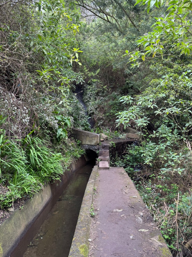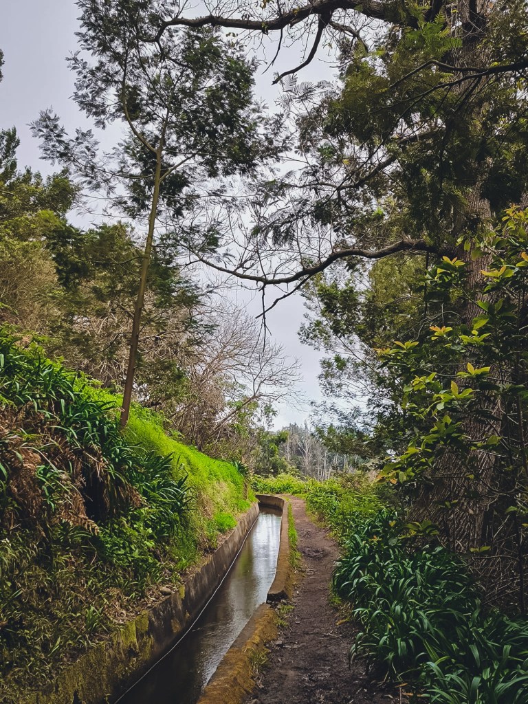 An einer Bushaltestelle queren wir die Straße und befinden uns schon bald am Eingang zur Levada dos Tornos. Entlang der Levada führt uns der Weg durch den schattigen Wald aus Eukalyptusbäumen und Kiefern. Es ist angenehm still und auf dem schmalen Pfad kommen uns nur wenige Wanderer entgegen.