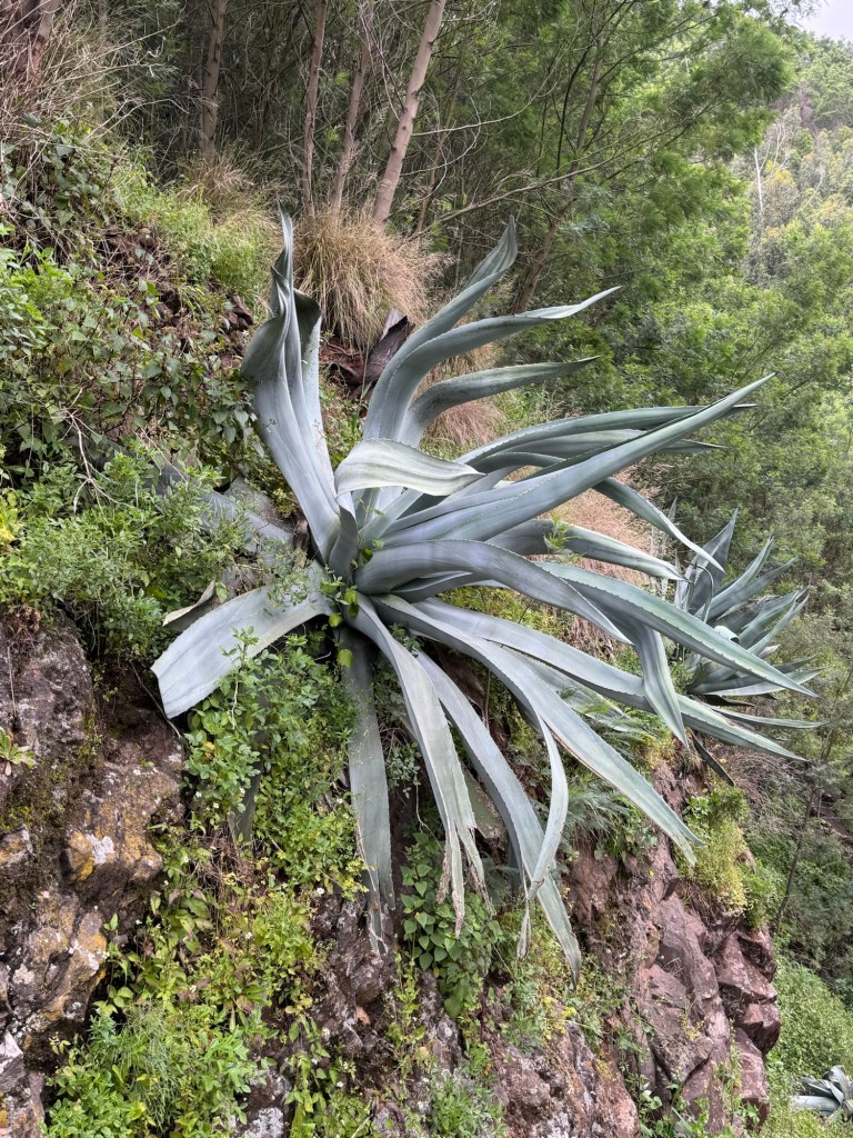 Wir folgen nun dem Weg zur Teleférico do Jardim Botânico, einer weiteren Seilbahnstation. Von hier führt uns ein schmaler Weg tief hinab in Tal der Ribeira de João Gomes. Staunend betrachten wir die sattgrüne Pflanzenwelt um uns herum. An der Berghängen wachsen wunderschöne Pflanzen, so dass wir kaum mit dem fotografieren aufhören können. Wir passieren eine Steinbrücke und beginnen mit dem Gegenanstieg und kommen in den kleinen Ort Curral dos Romeiros.